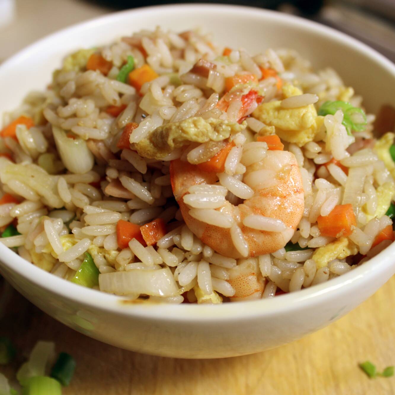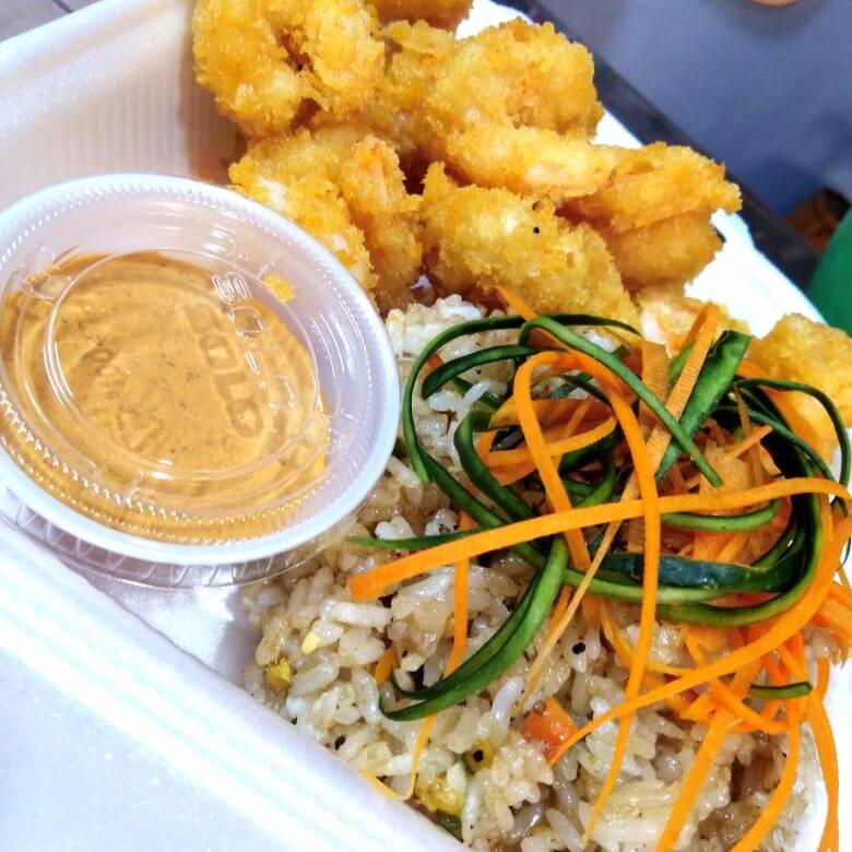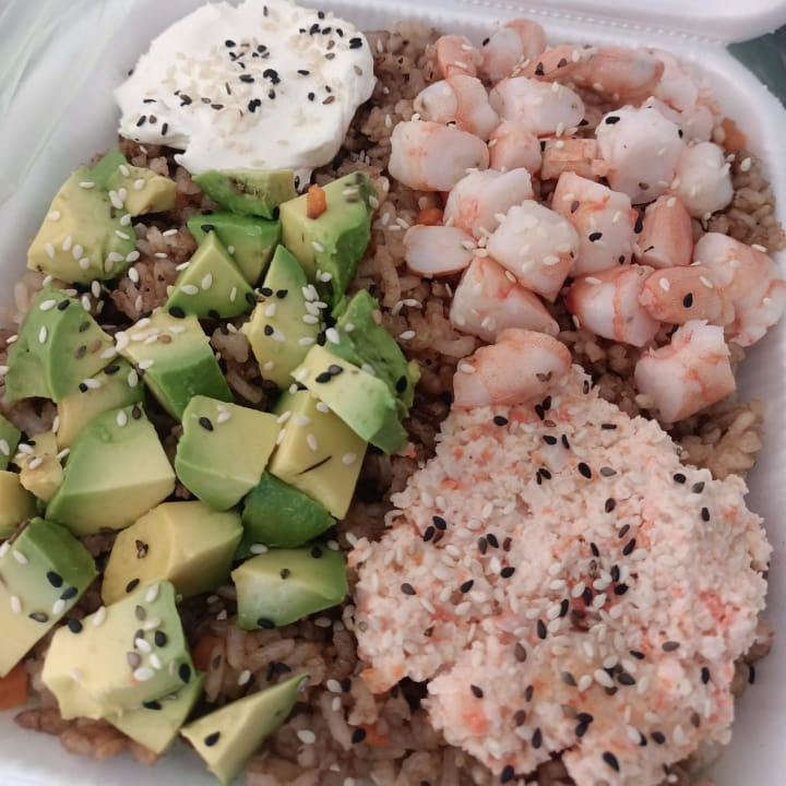 Porcion grande de arroz frito, aguacate, philadelphia, Tampico y Camarones de la casa.