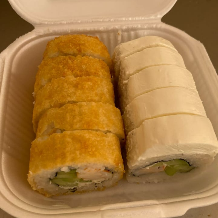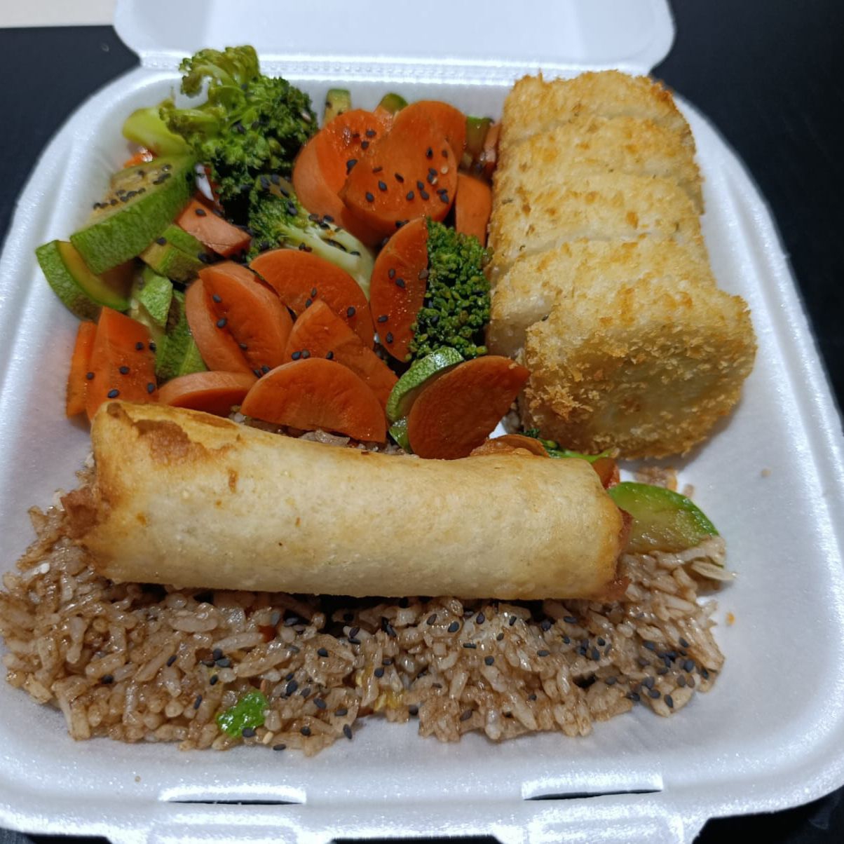 Medio sushi empanizado de camaron , medio teppanyaki ,arroz frito y un rollo primavera