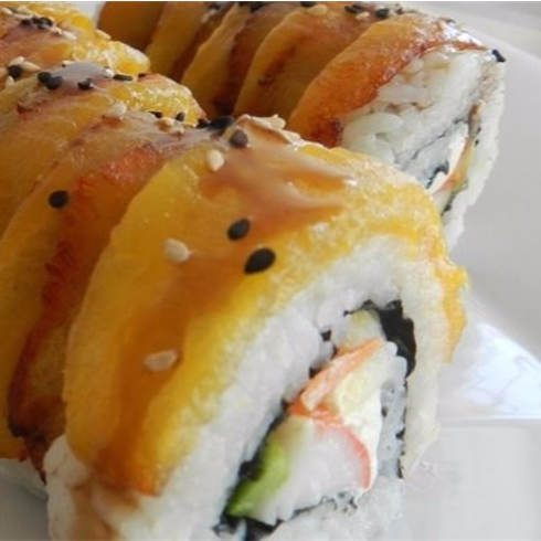 Rollo empanizado, camarones por dentro, pepino, philadelphia. Coronado con Surimi empanizado y Tampico