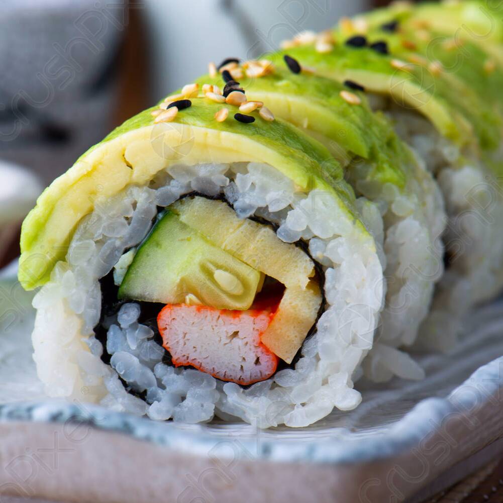 Rollo envuelto en aguacate , por dentro pepino, philadelphia y proteina a elegir