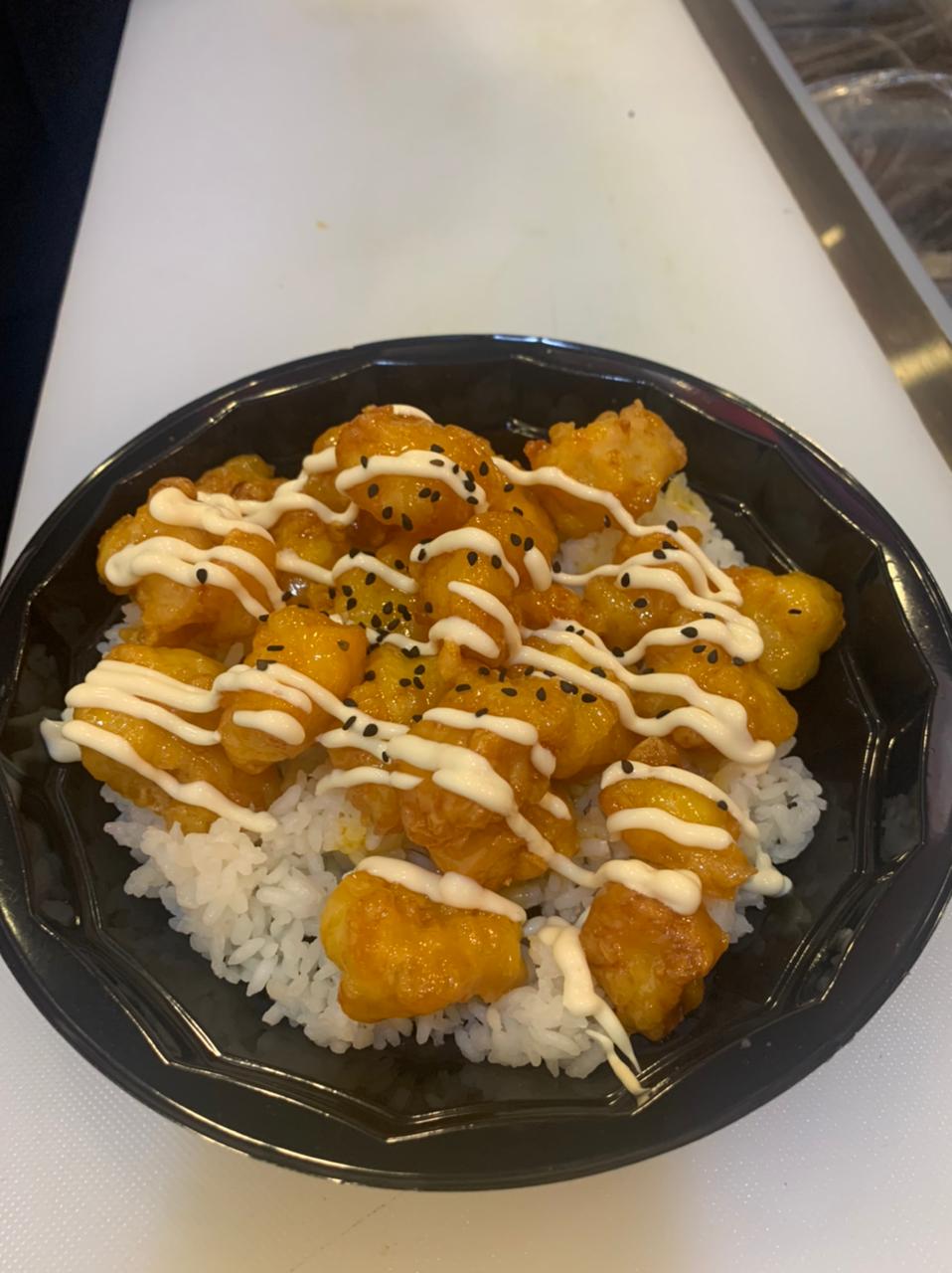 Pollo capeado, barnizado en salsa yakisoba, sobre arroz gohan.