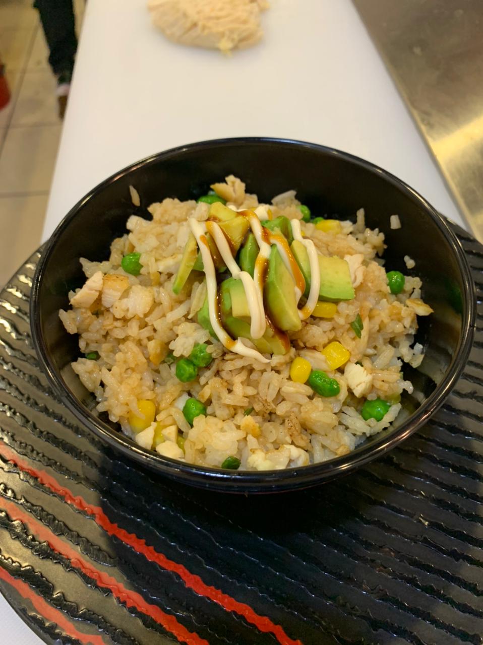 Arroz frito, con zanahoria, calabaza, cebolla, salsa de soya con carne a elegir pollo con aguacate.