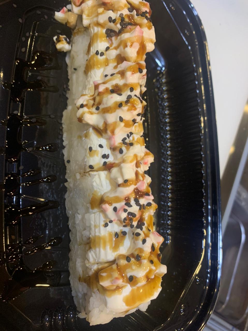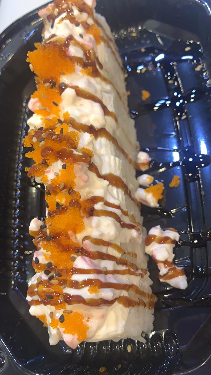 Cubierto de philadelphia, camarón empanizado, salsa de anguila y ajonjolí, relleno de pepino, aguacate y anguila.
