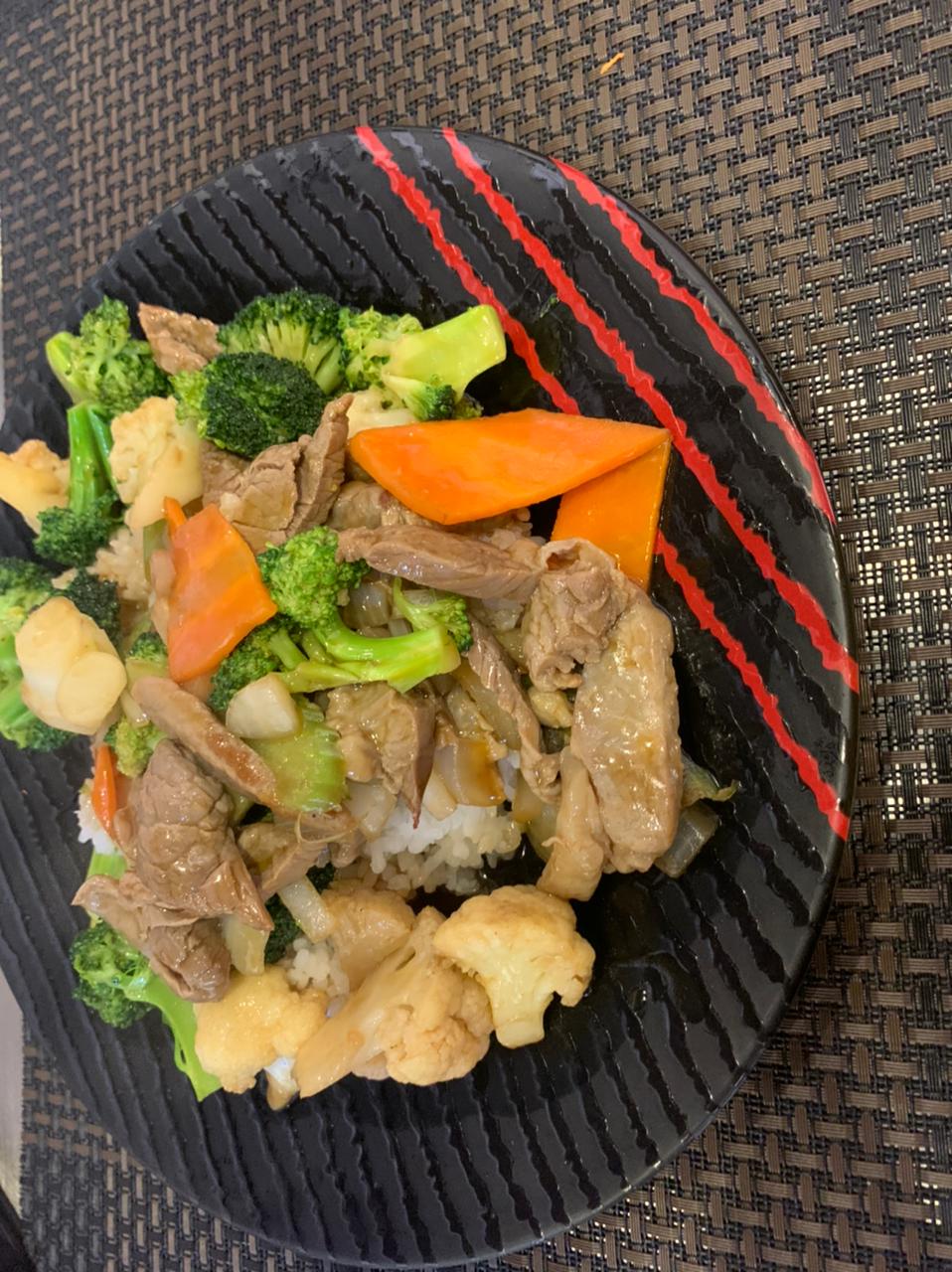 Vegetales salteados con salsa teriyaki sobre arroz gohan.