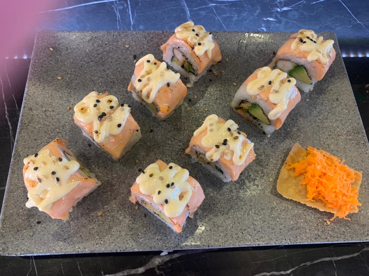 Cubierto de salmón, relleno de camarón, aguacate, philadelphia con salsa de anguila.