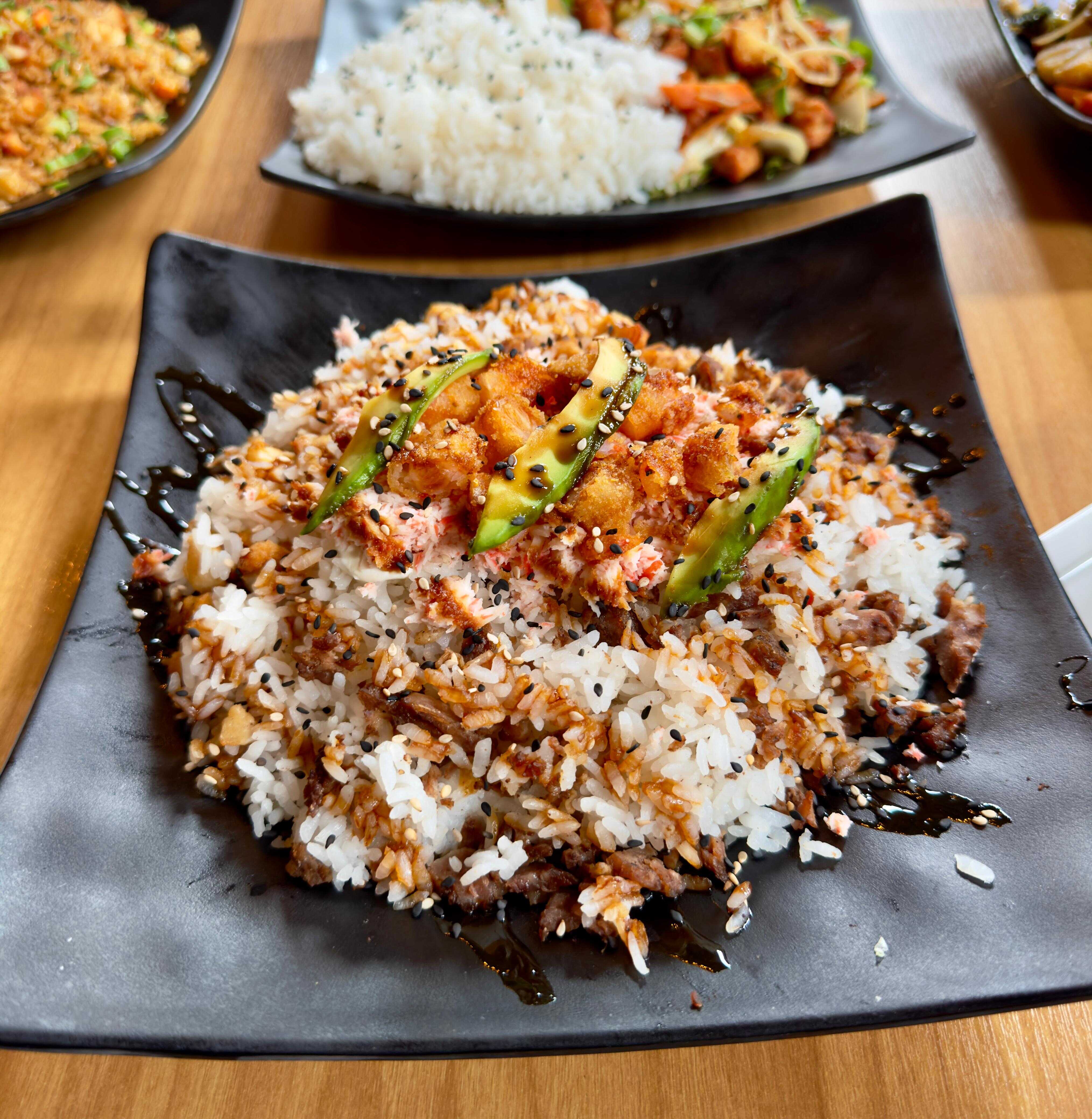 1 Orden de arroz blanco con res, pollo, camarón, philadelphia, tampico, aguacate, anguila y ajonjoli.
