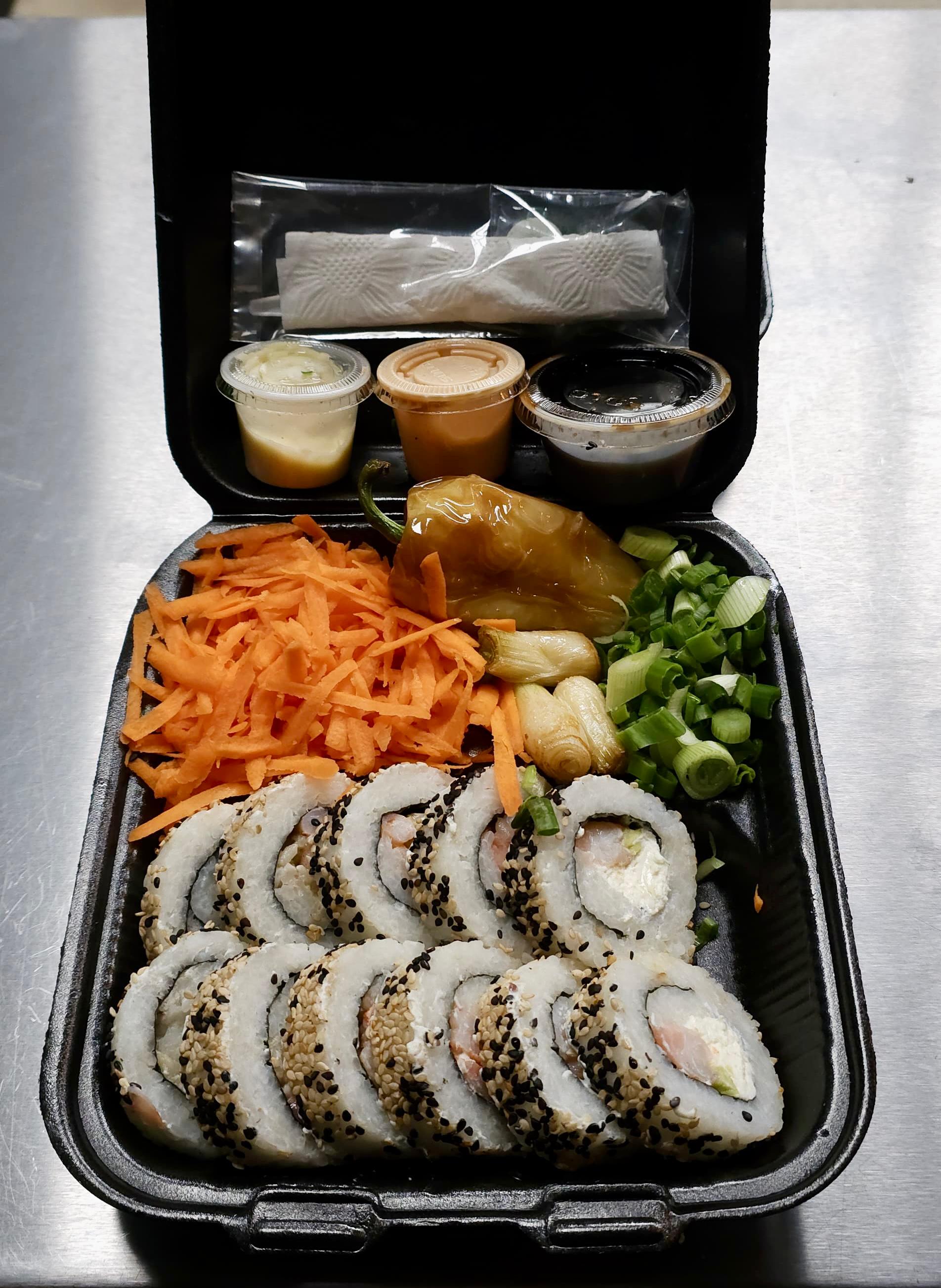 Sushi natural de res, pollo, phila y aguacate, coronado con un spicy de tocino al horno, con todos sus complementos y guarniciones.