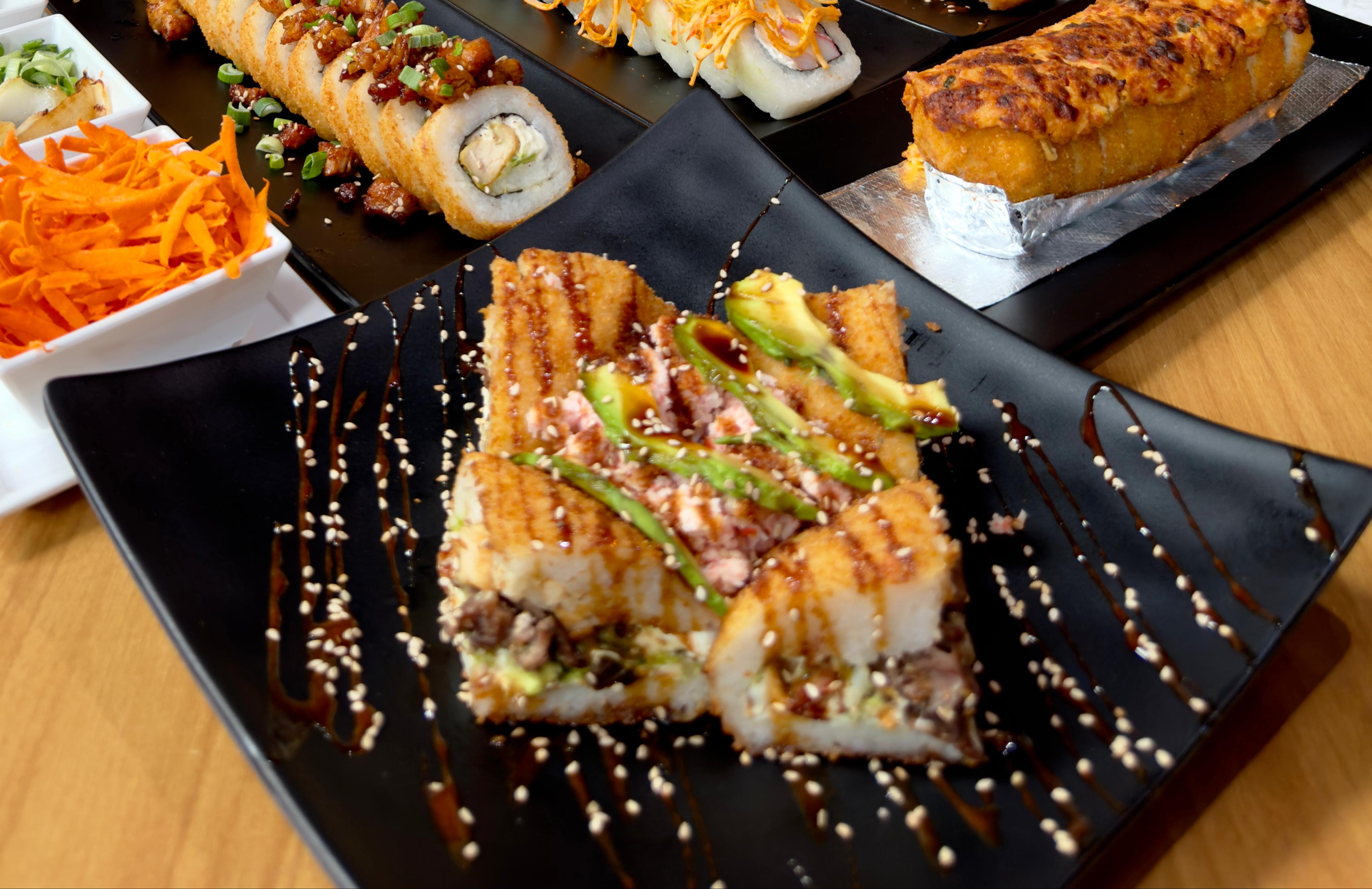Sushi empanizado de res, pollo, phila y aguacate, coronado con spicy de tocino al horno. con todos sus complementos y guarniciones.