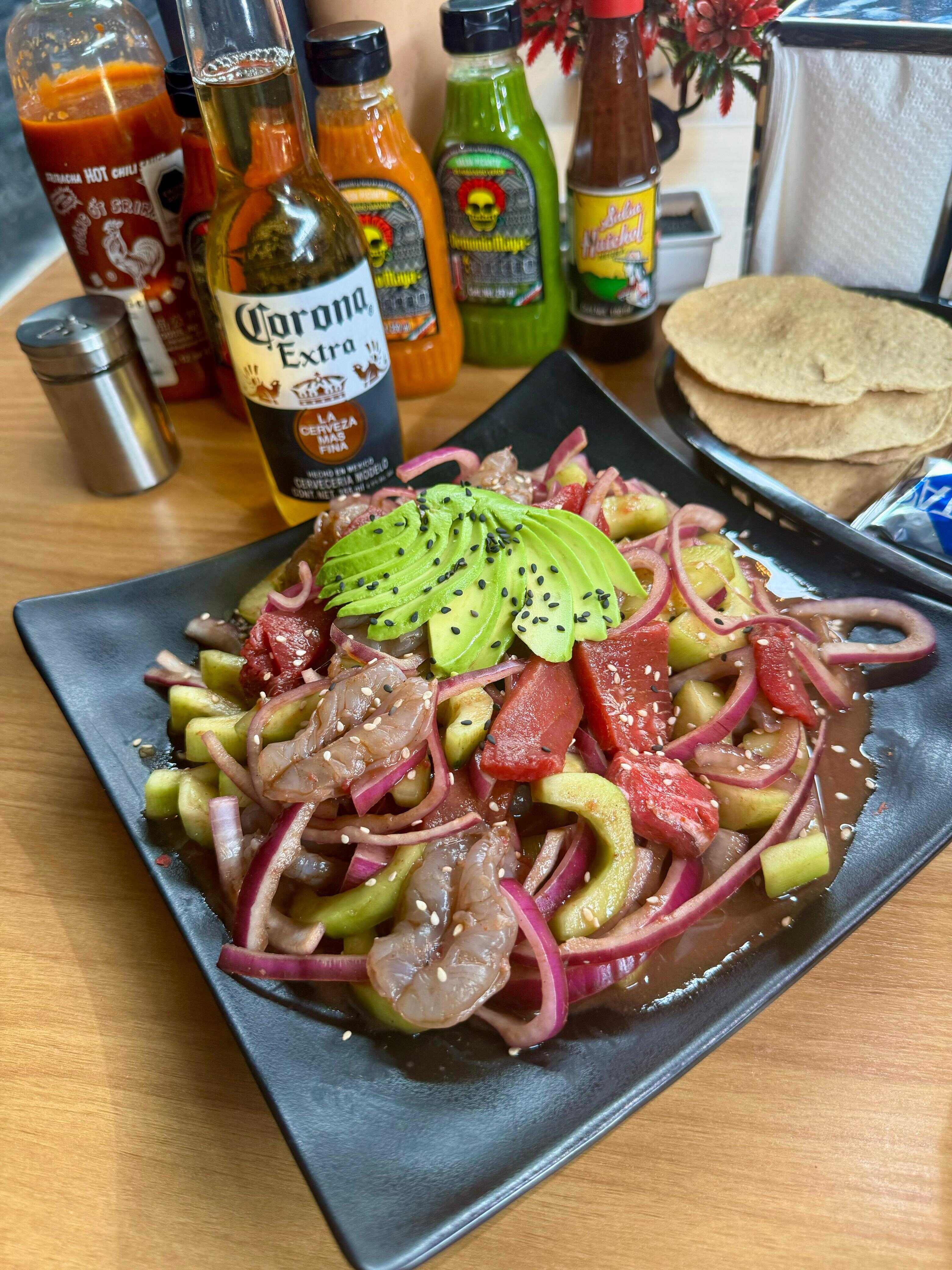 Atún, camarón cocido, cebolla morada, chile serrano, ajonjolí y aguacate