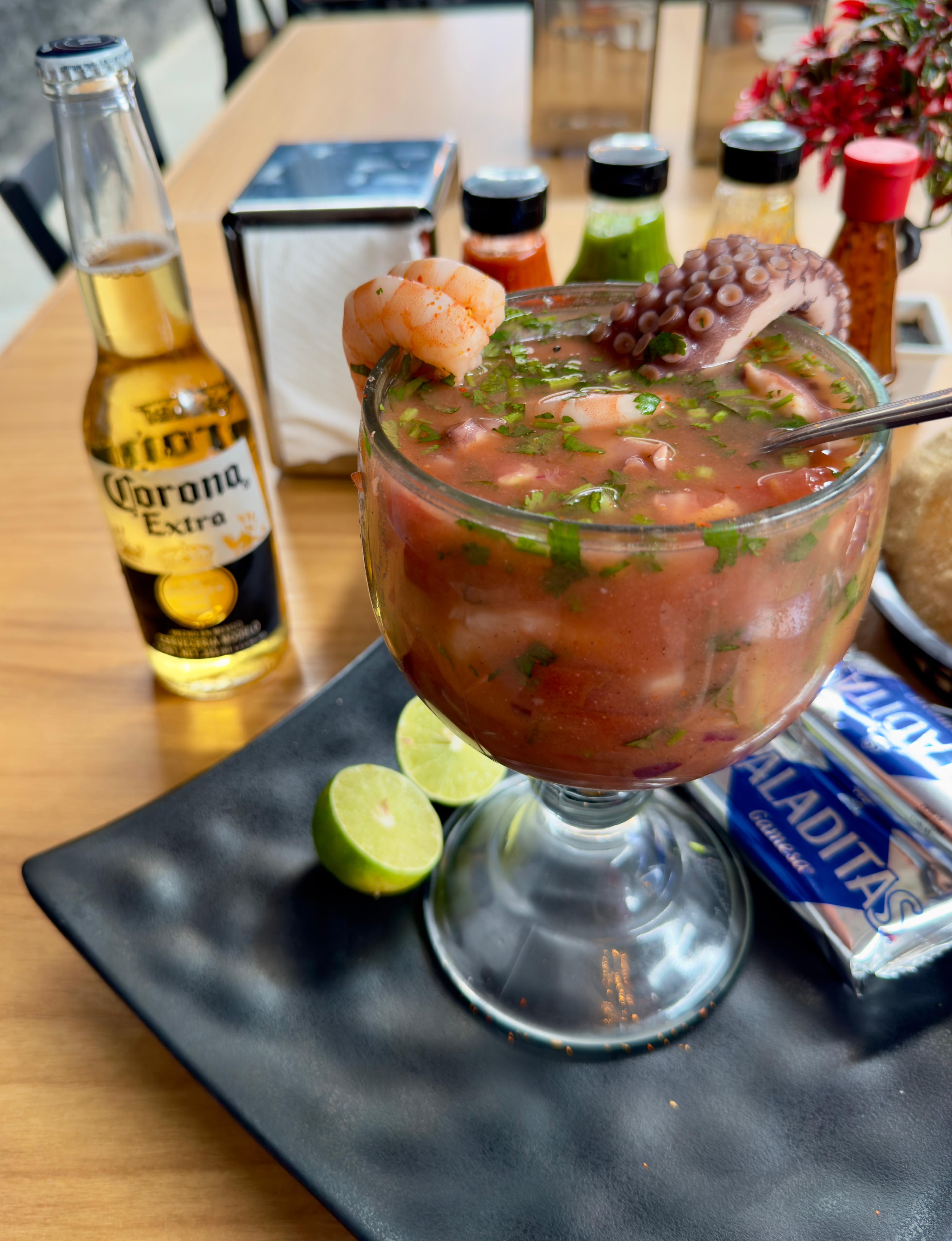 Camarón crudo, camarón cocido y ceviche en salsa de aguachile