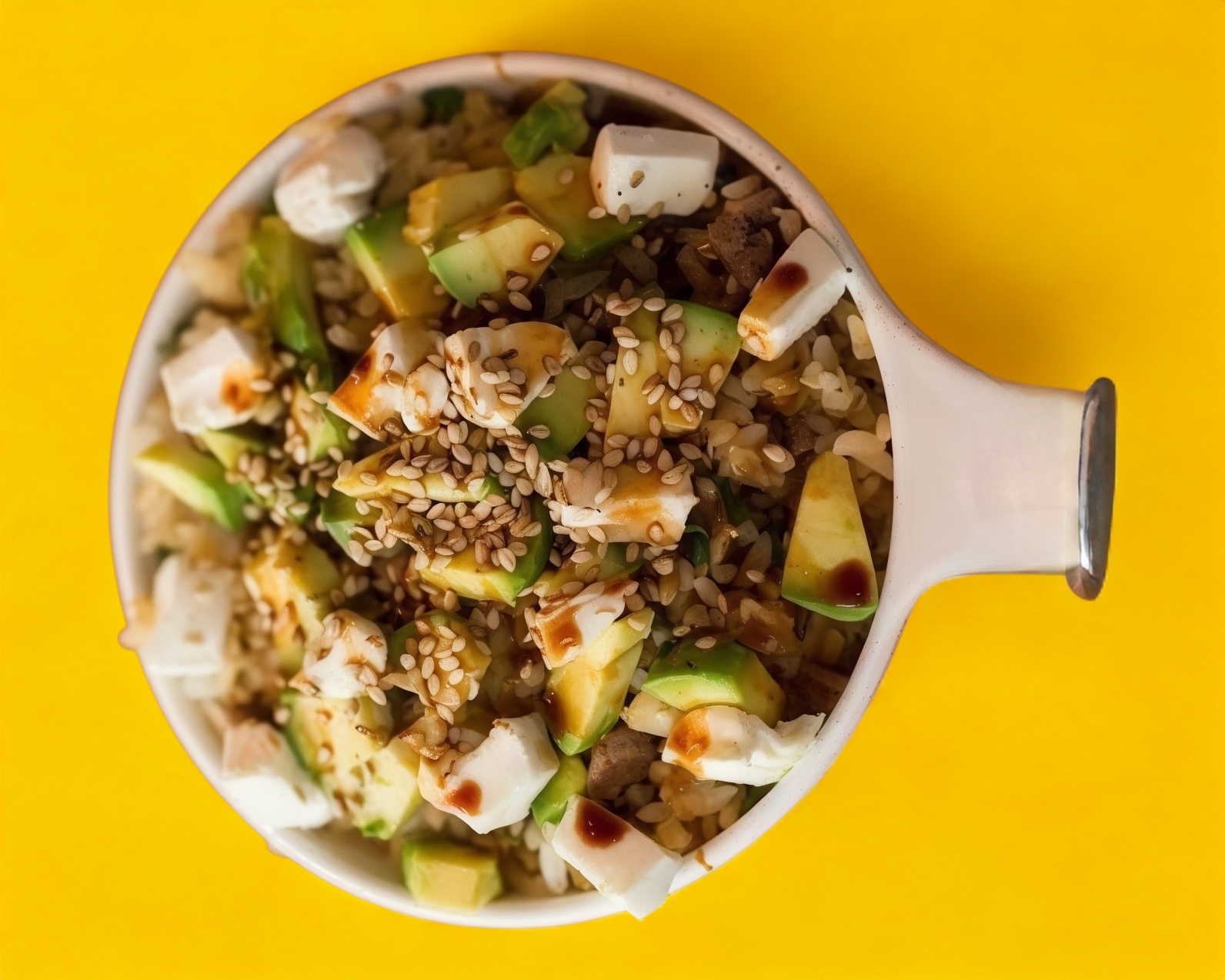Arroz frito con calabaza y zanahoria acompañado de aguacate, queso filadelfia,aderezo de tampico y ajonjoli.