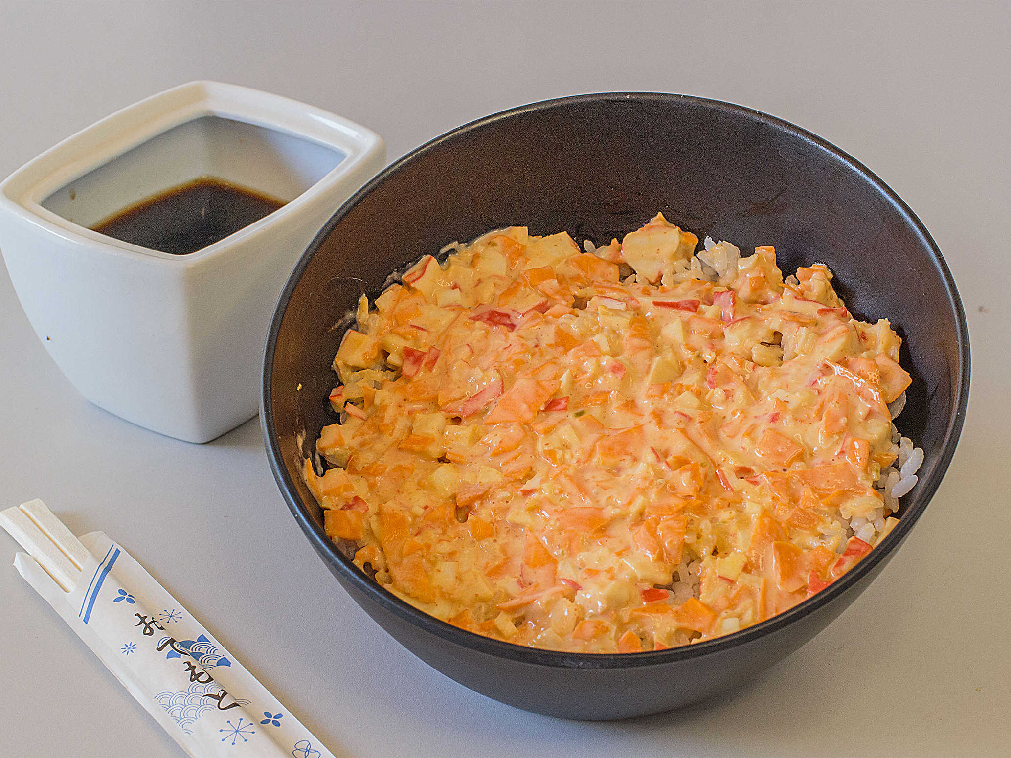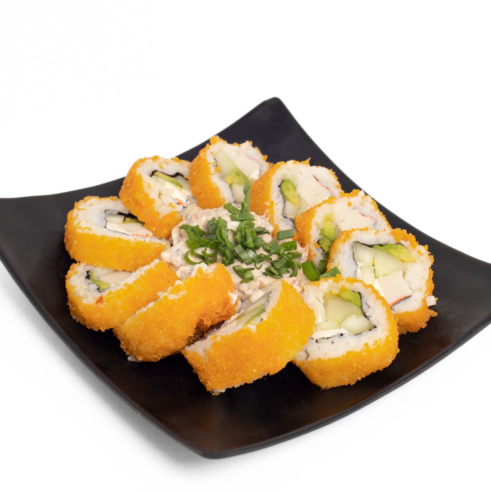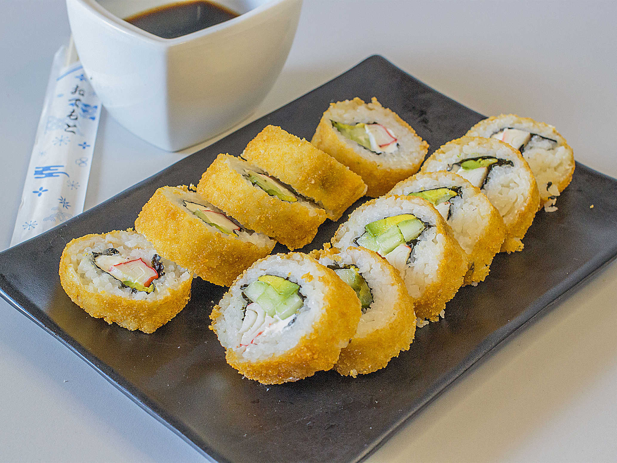 rollo empanizado de surimi, coronado con una ensalada de Tori