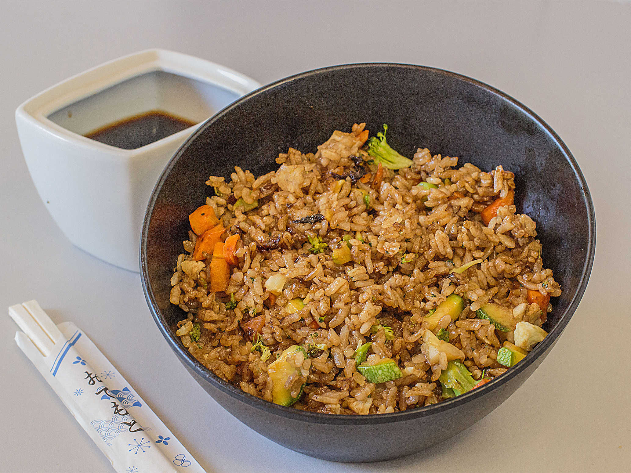 Arroz frito con ingredientes, mas un refrescos