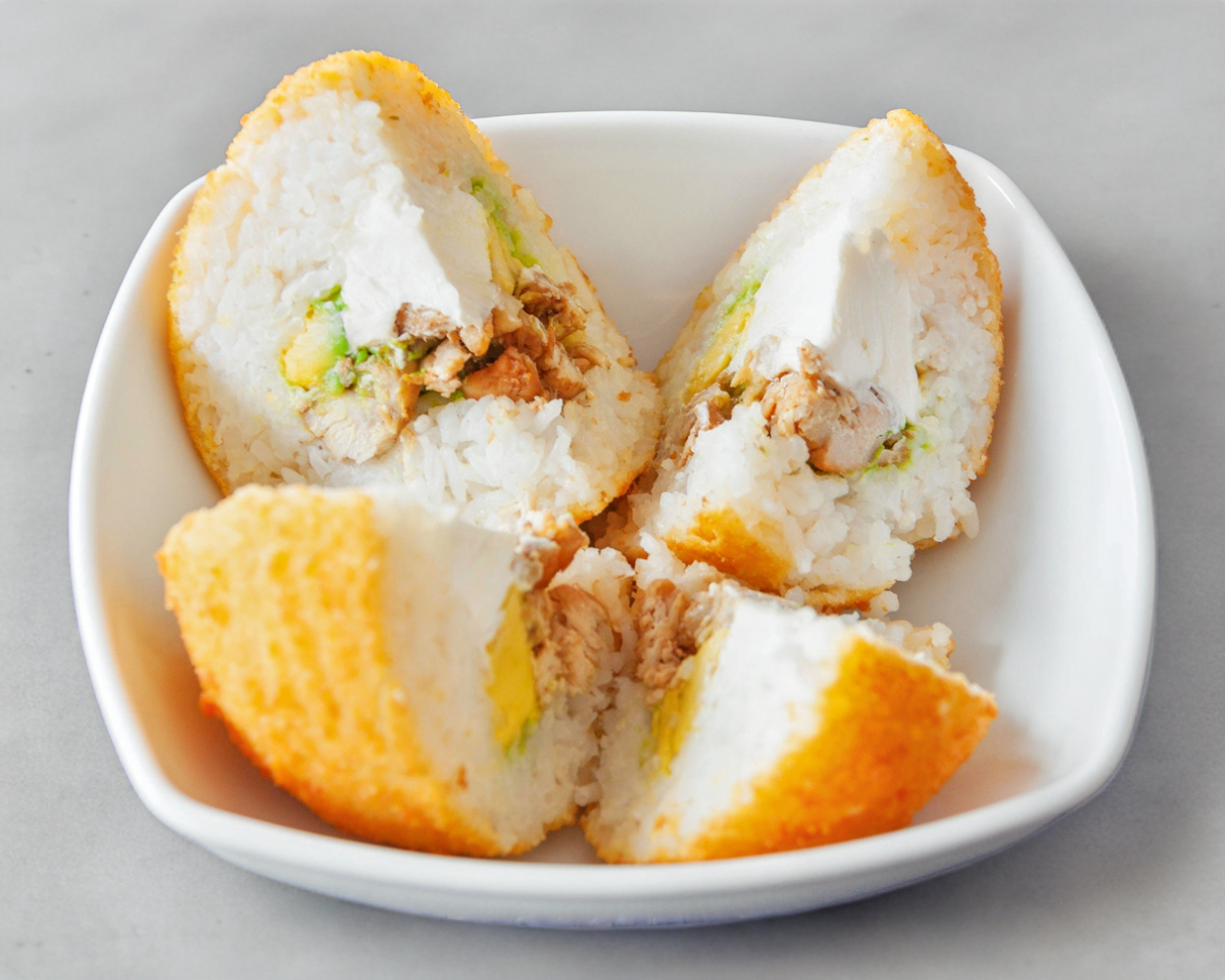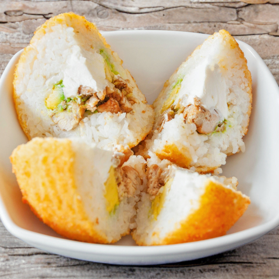Bola de arroz empanizada, rellena de Philadelphia, aguacate y complementos.