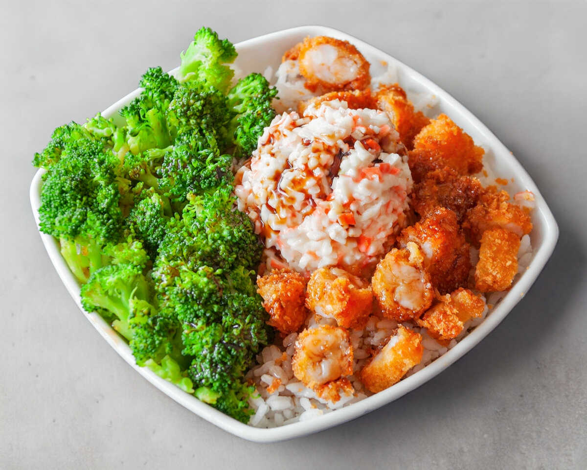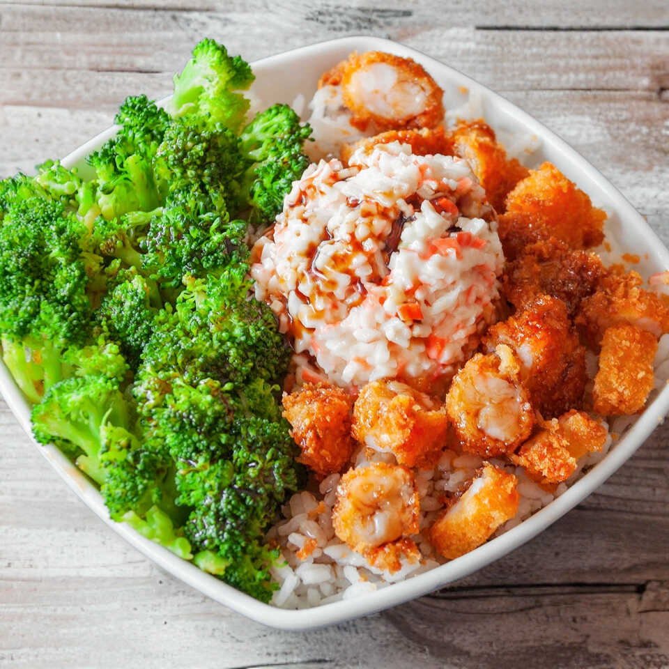Ensalada tampico, brócoli, camarones empanizados y bañado en salsa de anguila.