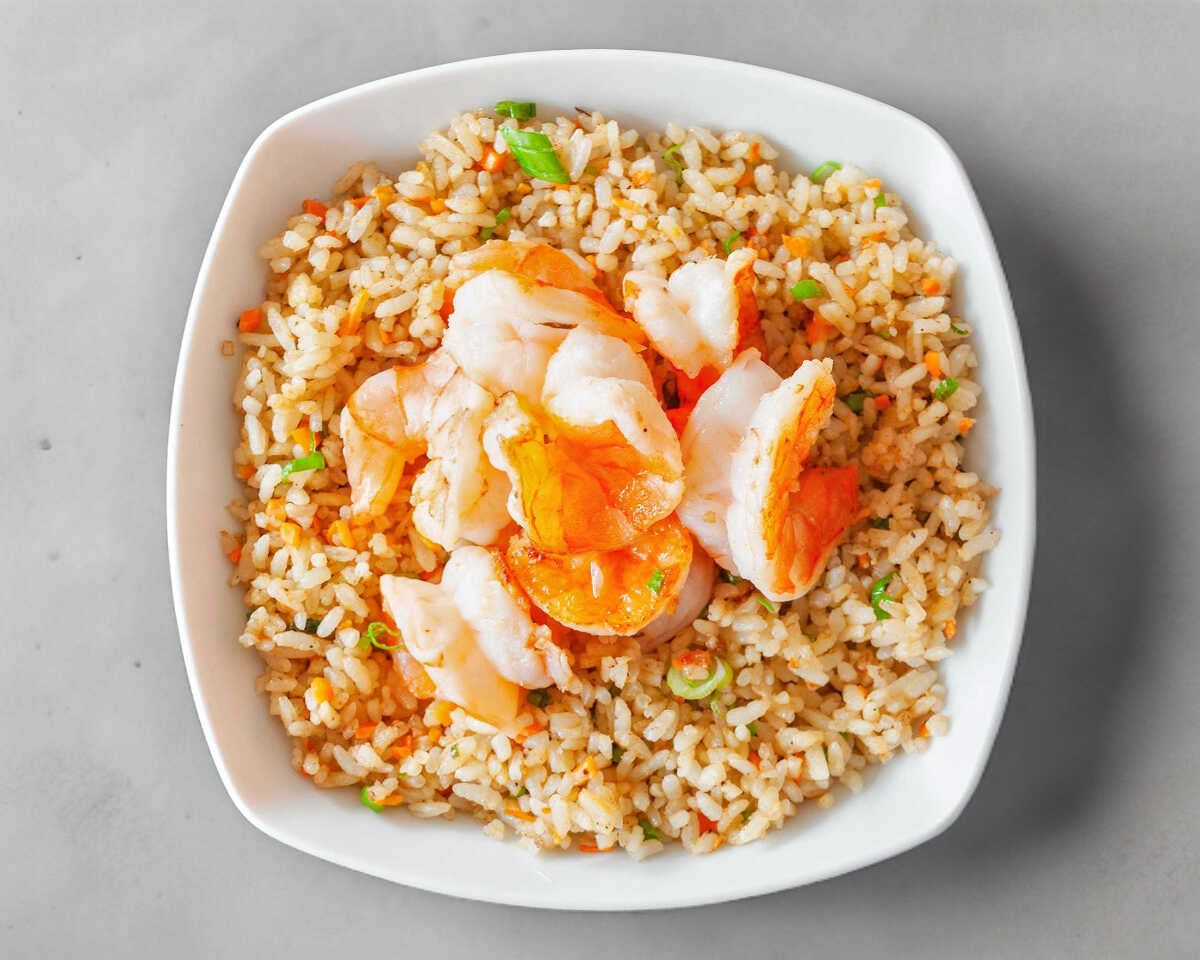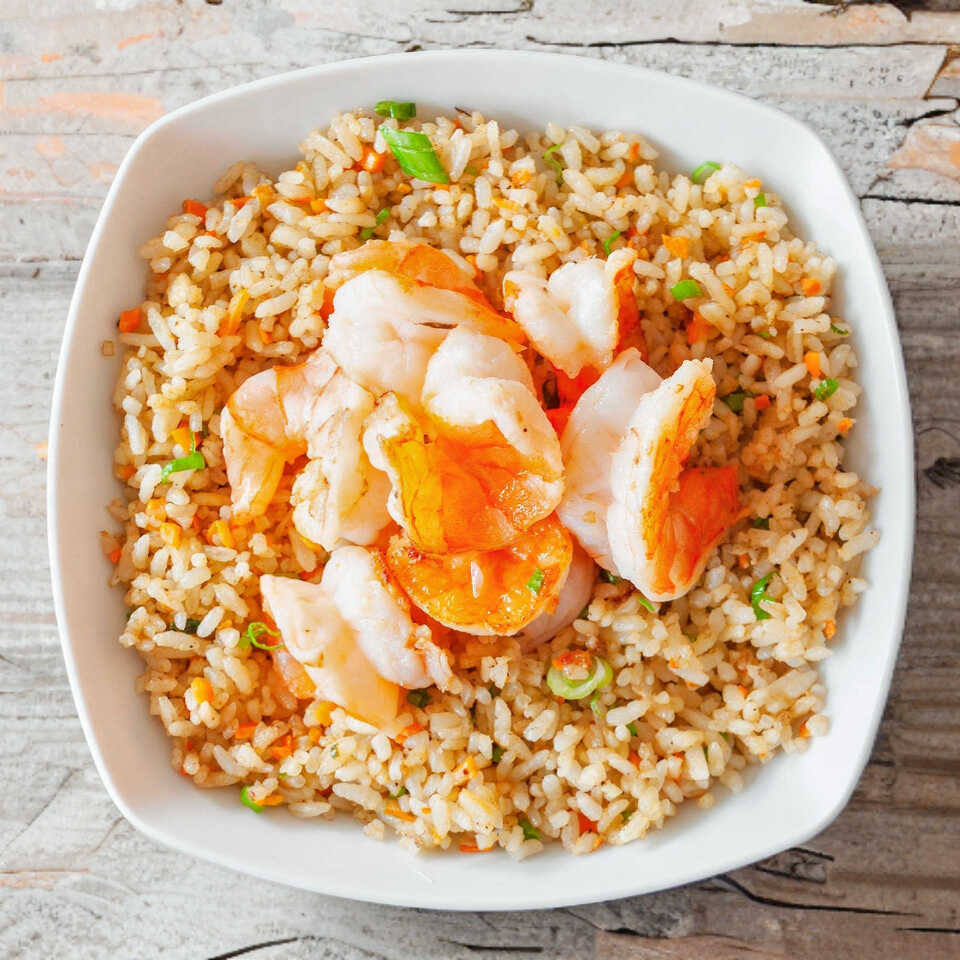 Verduras a la plancha con camarones, acompañadas con arroz.