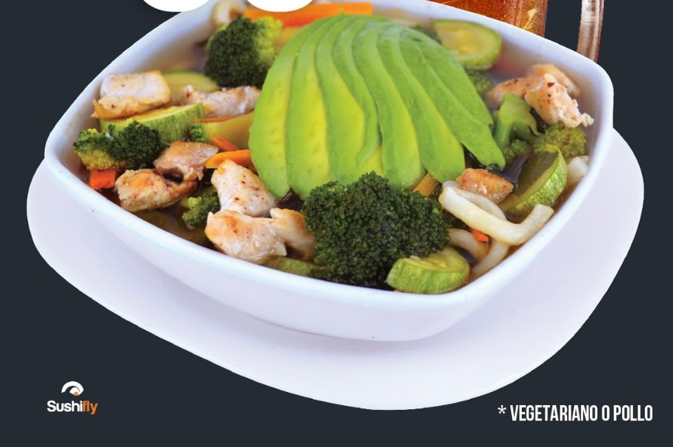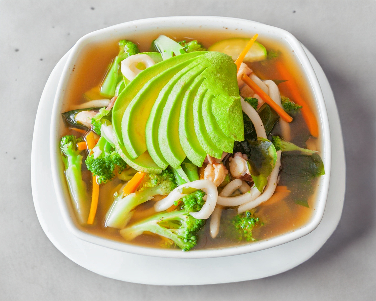 Consomé acompañado de pasta udon, brócoli, calabaza, zanahoria, especias, aguacate y carne.