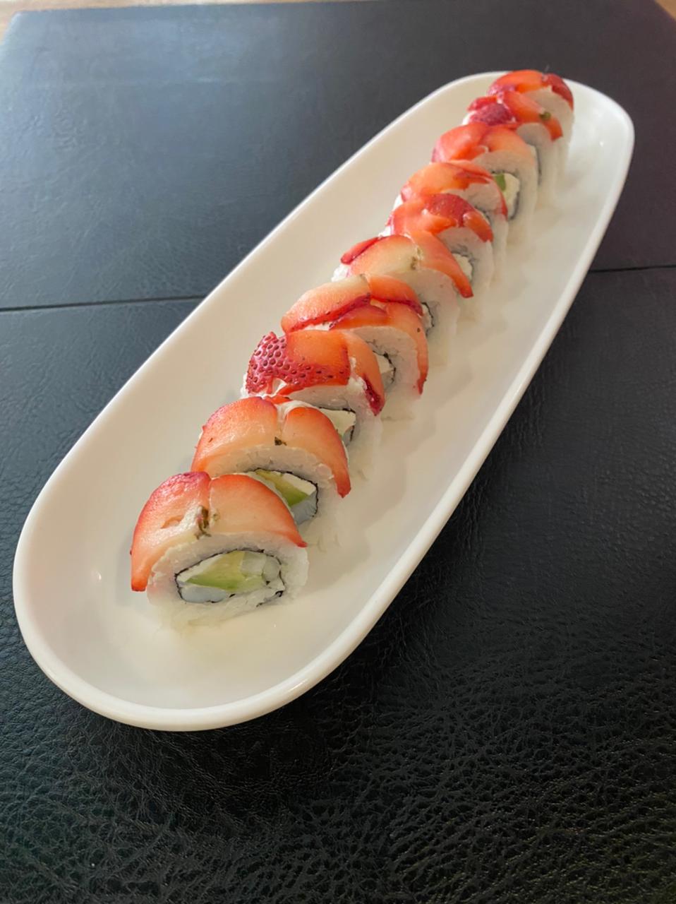 Rollo envuelto en fresa con philadelphia relleno de pepino, aguacate y marisco a elegir