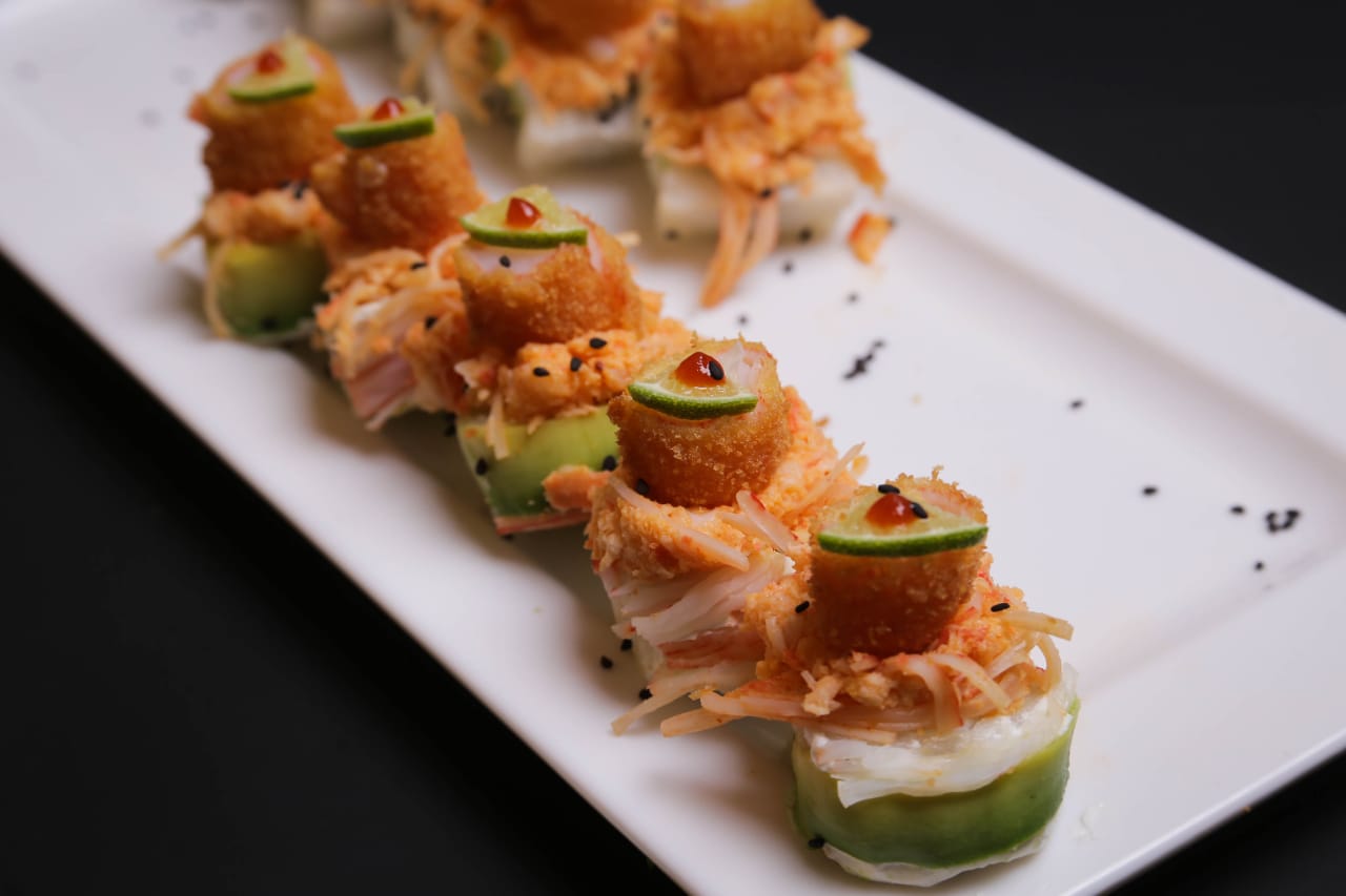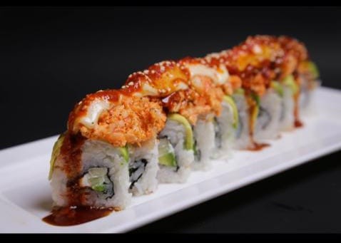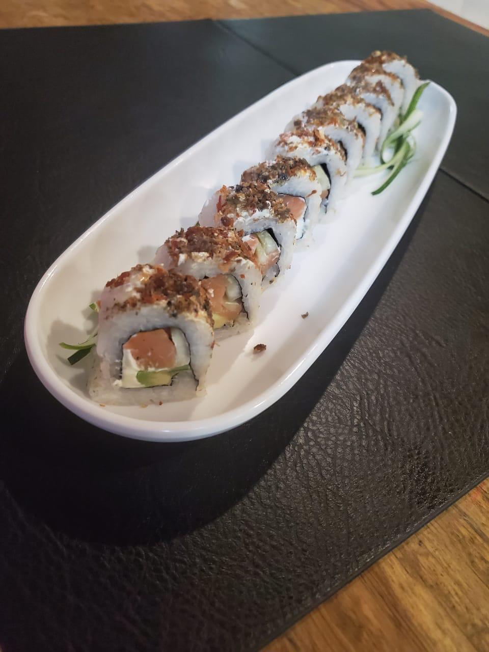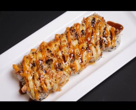 Rollo relleno de Kani , pepino, aguacate y Philadelphia con toping de Kani , Salmón y calló de Acha Salteados, todo esto cubierto en aderezo Spicy Mayo Flameado y bañado en salsa de anguila