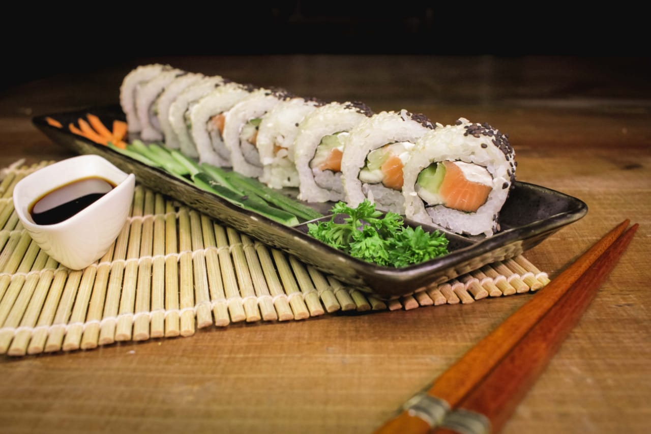 Arroz por fuera cubierto de ajonjolí relleno de salmón fresco, aguacate y philadelphia