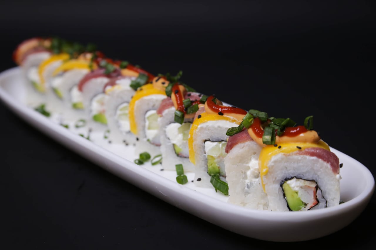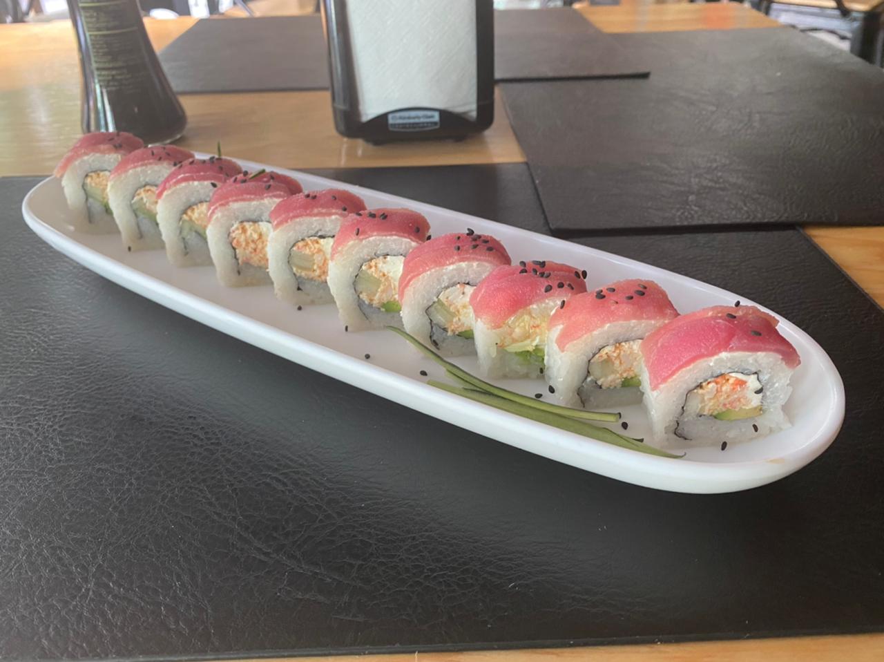 Rollo relleno de Kani , pepino,aguacate y Philadelphia , cubierto con atún fresco , mango o durazno según la temporada, con aderezo chipotle y shiracha