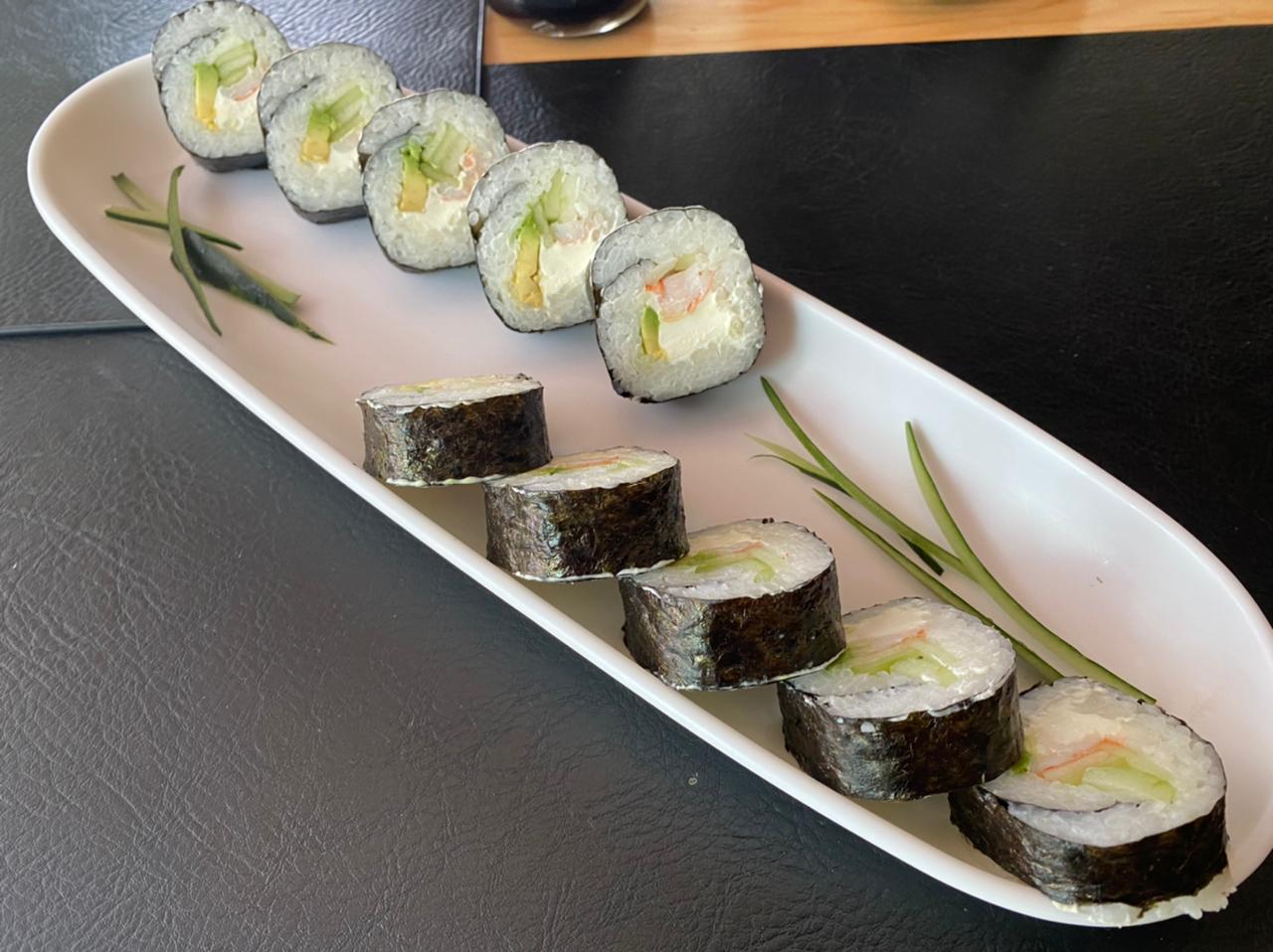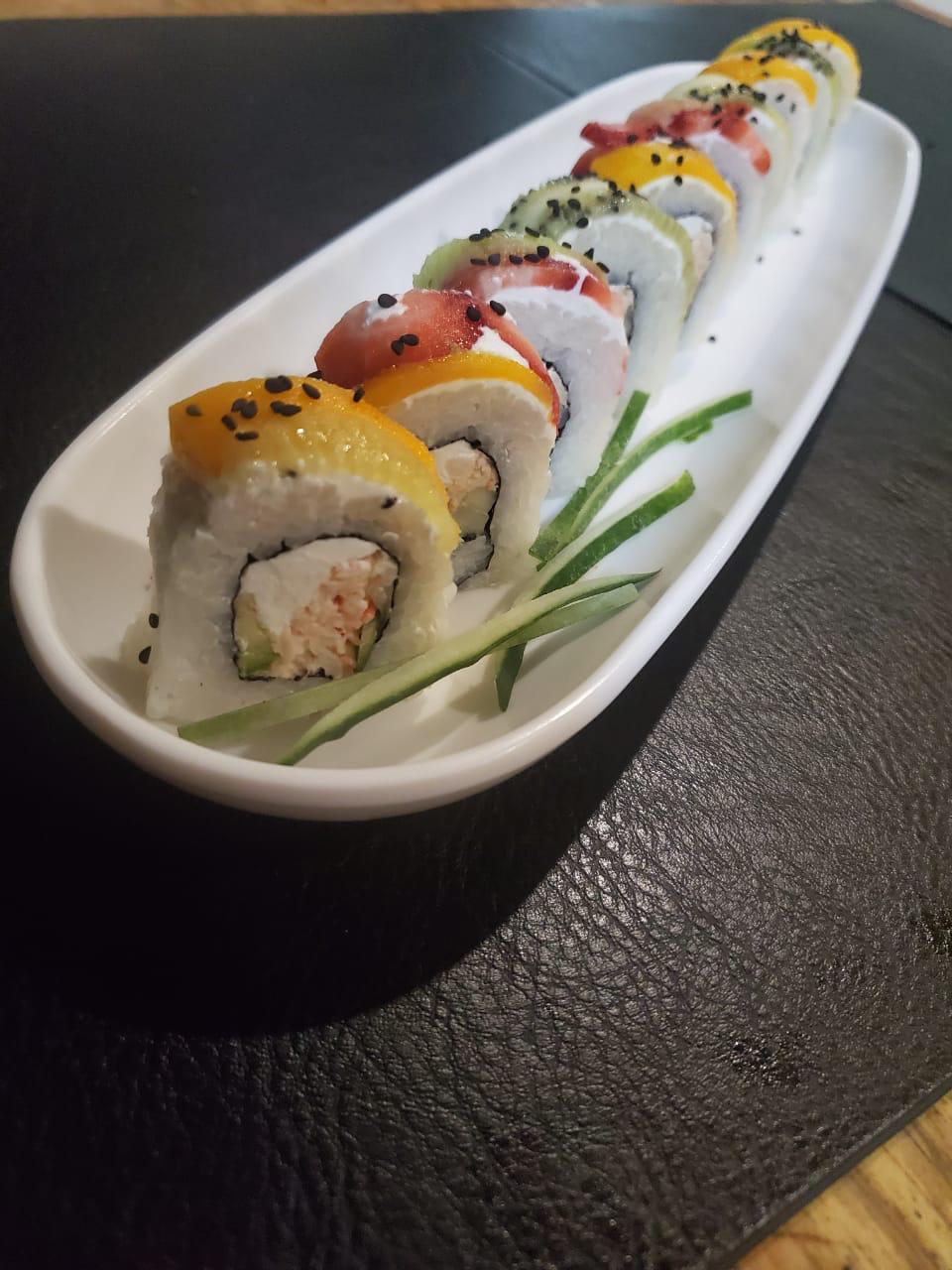 Rollo cubierto de mango, kiwi y fresa, philadelphia relleno de pepino, aguacate y marisco a elegir