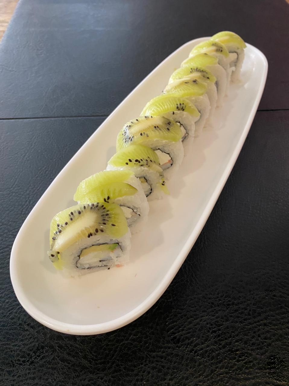 Rollo cubierto de kiwi con philadelphia rellenode pepino, aguacate y mariscos a elegir