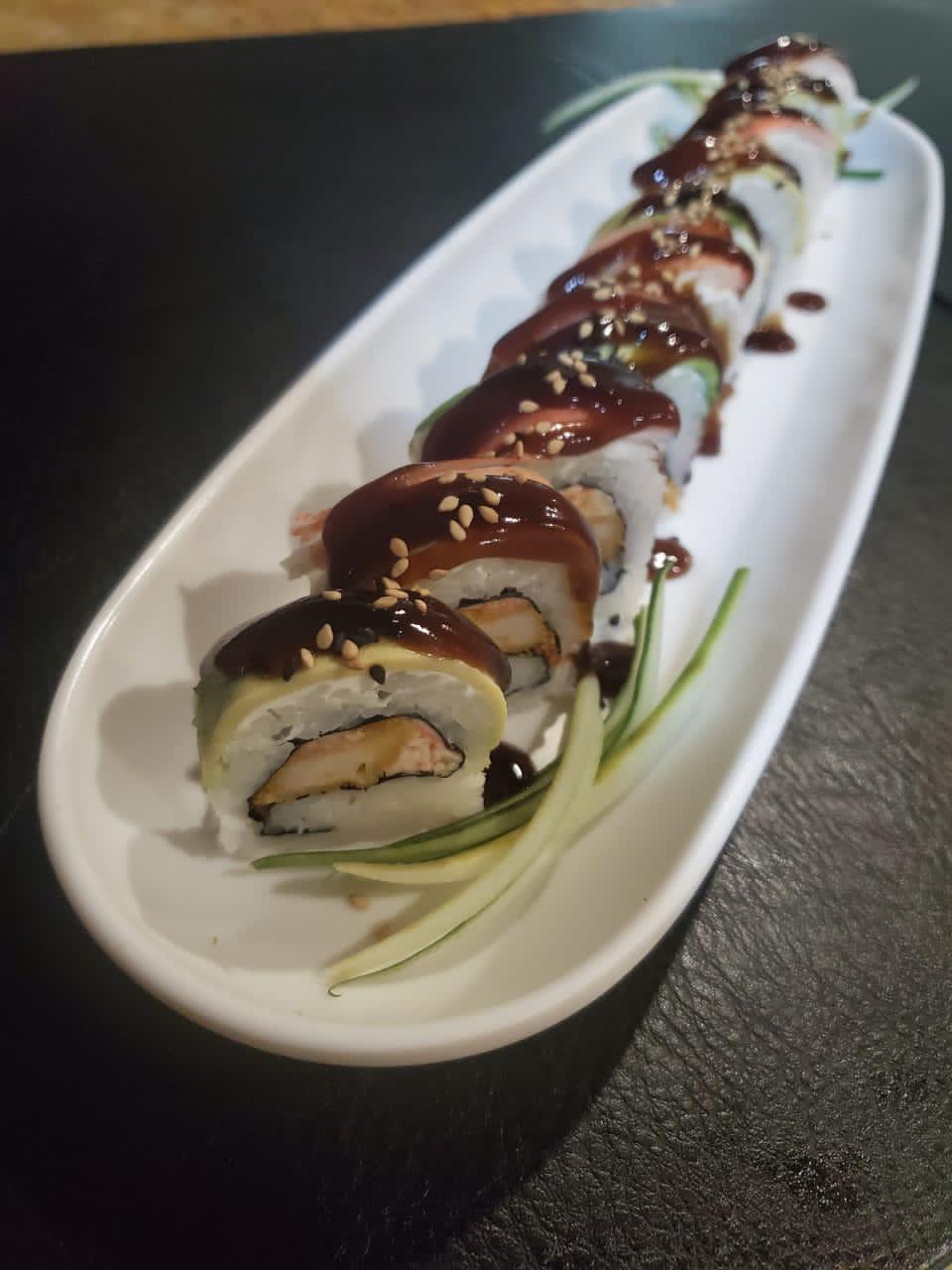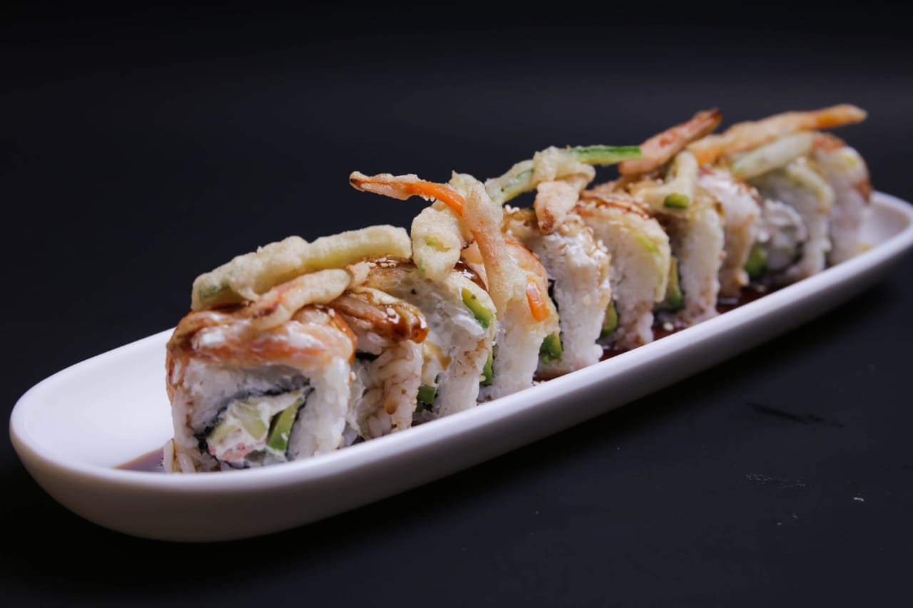 Rollo relleno de pepino,aguacate, Kani y Philadelphia cubierto de crujientes vegetales en Tempura bañado en salsa de anguila