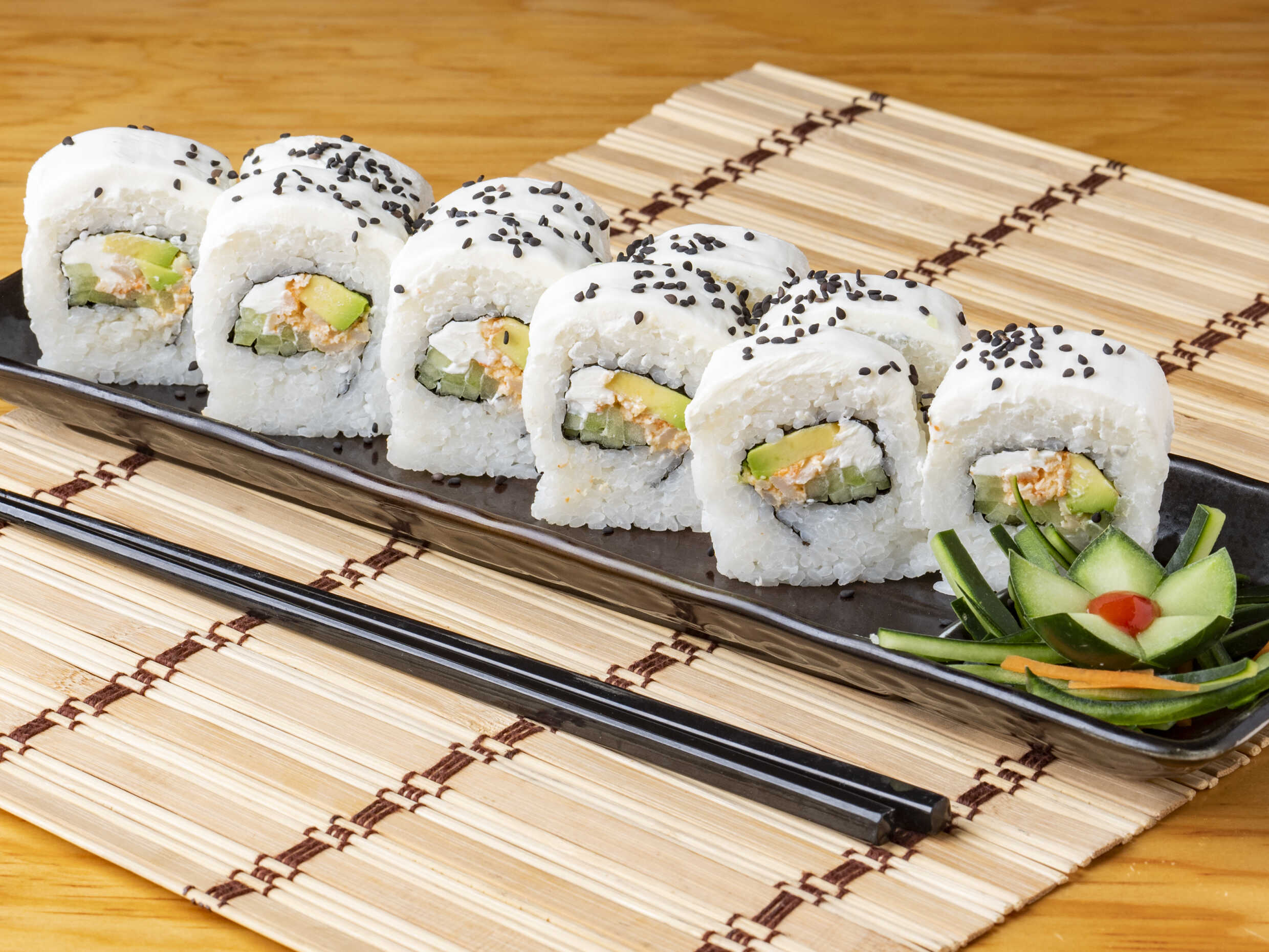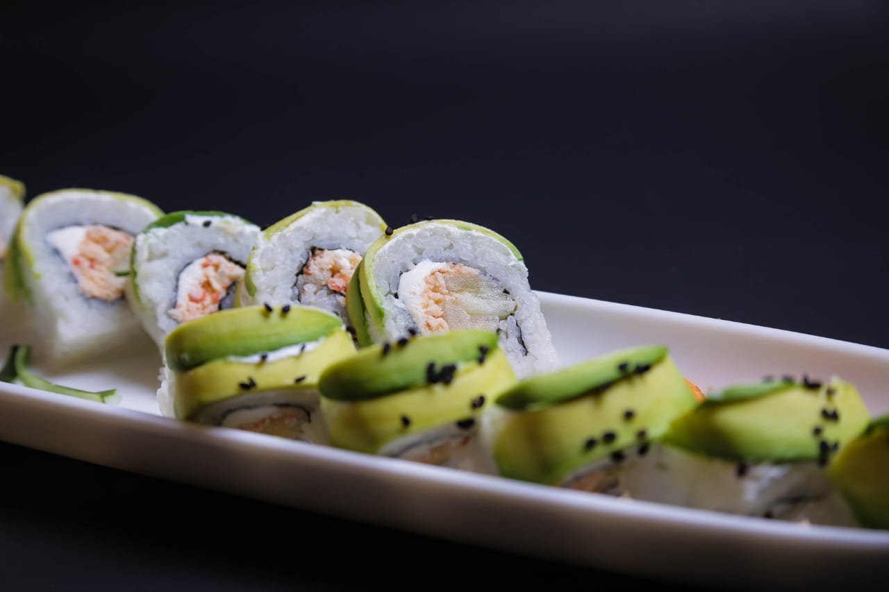 Rollo envuelto en aguacate relleno de pepino, philadelphia y marisco a elegir