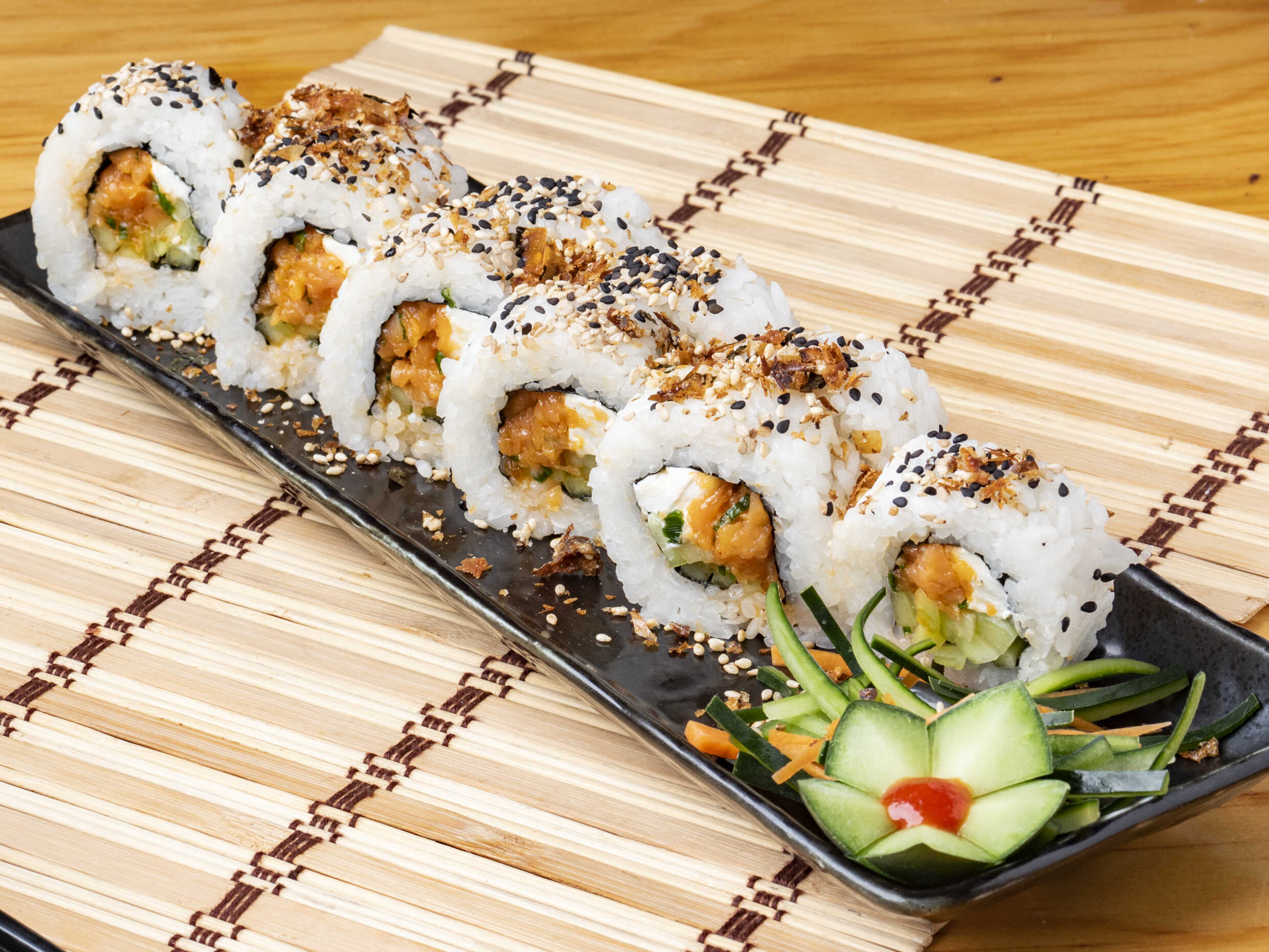 Arroz por fuera cubiertos de ajonjoli relleno de salmon picosito, pepino y philadelphia, con un toque de furikake