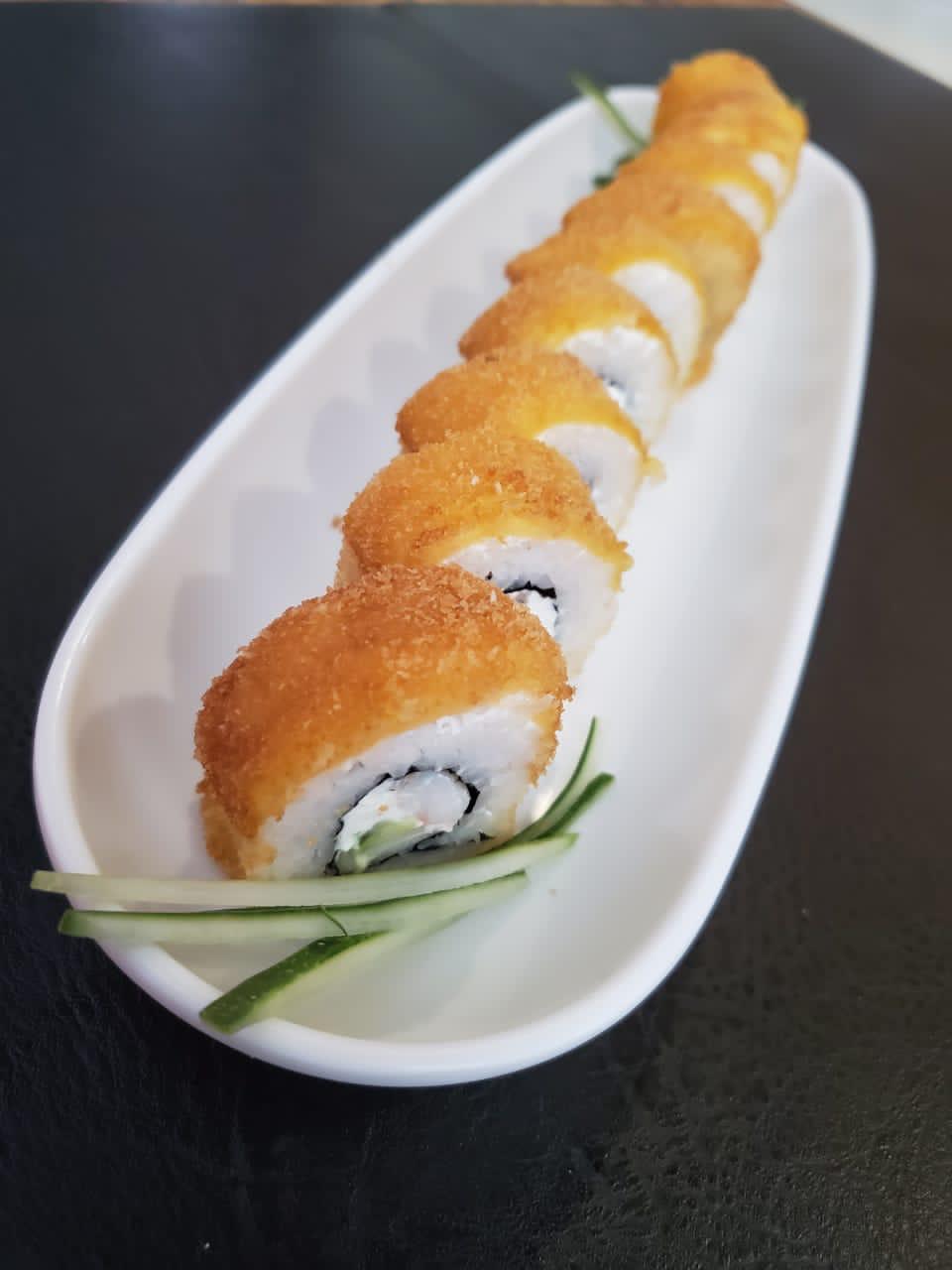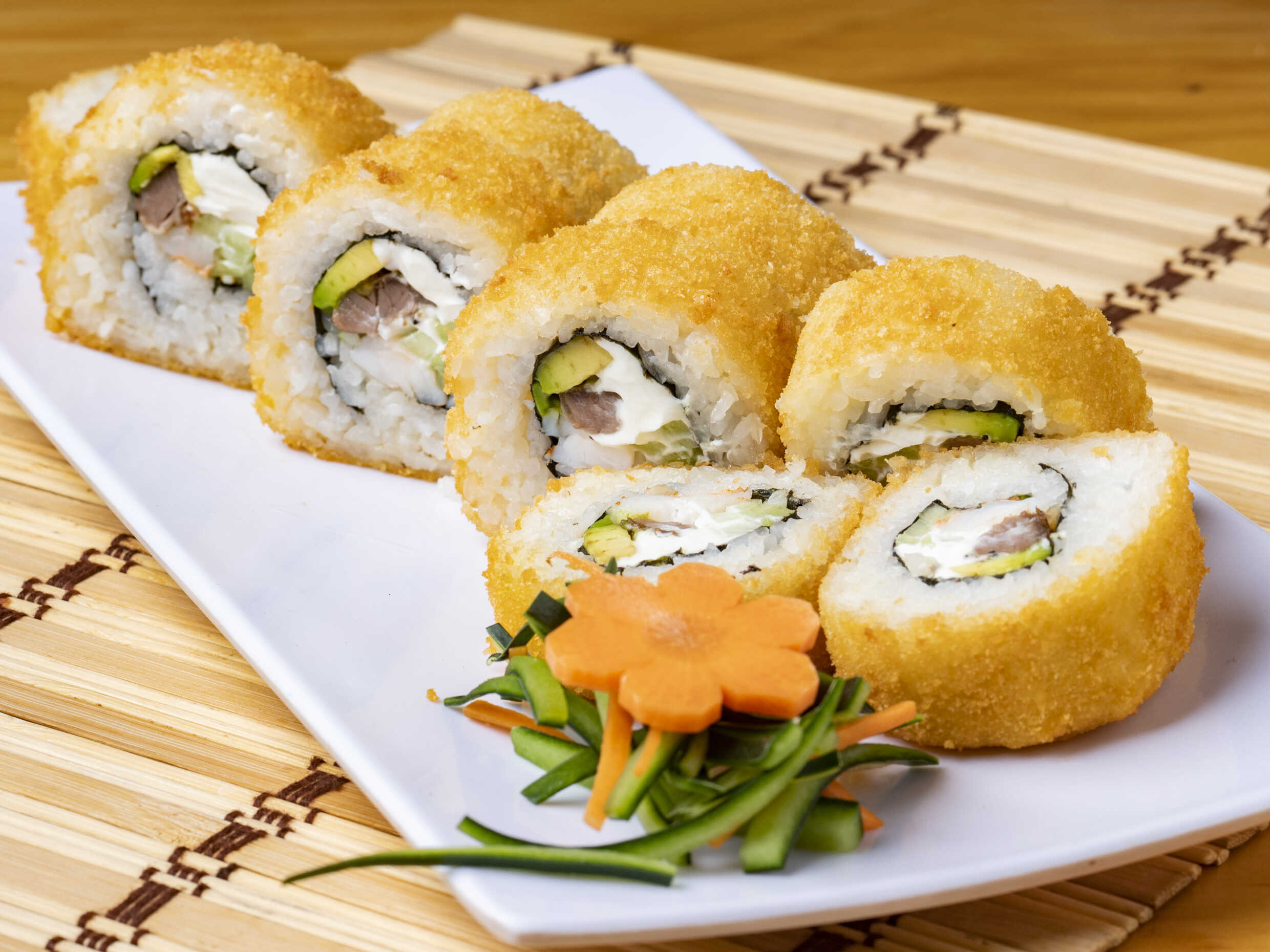 Rollo empanizado relleno de pepino, aguacate, philadelphia, camaron y res