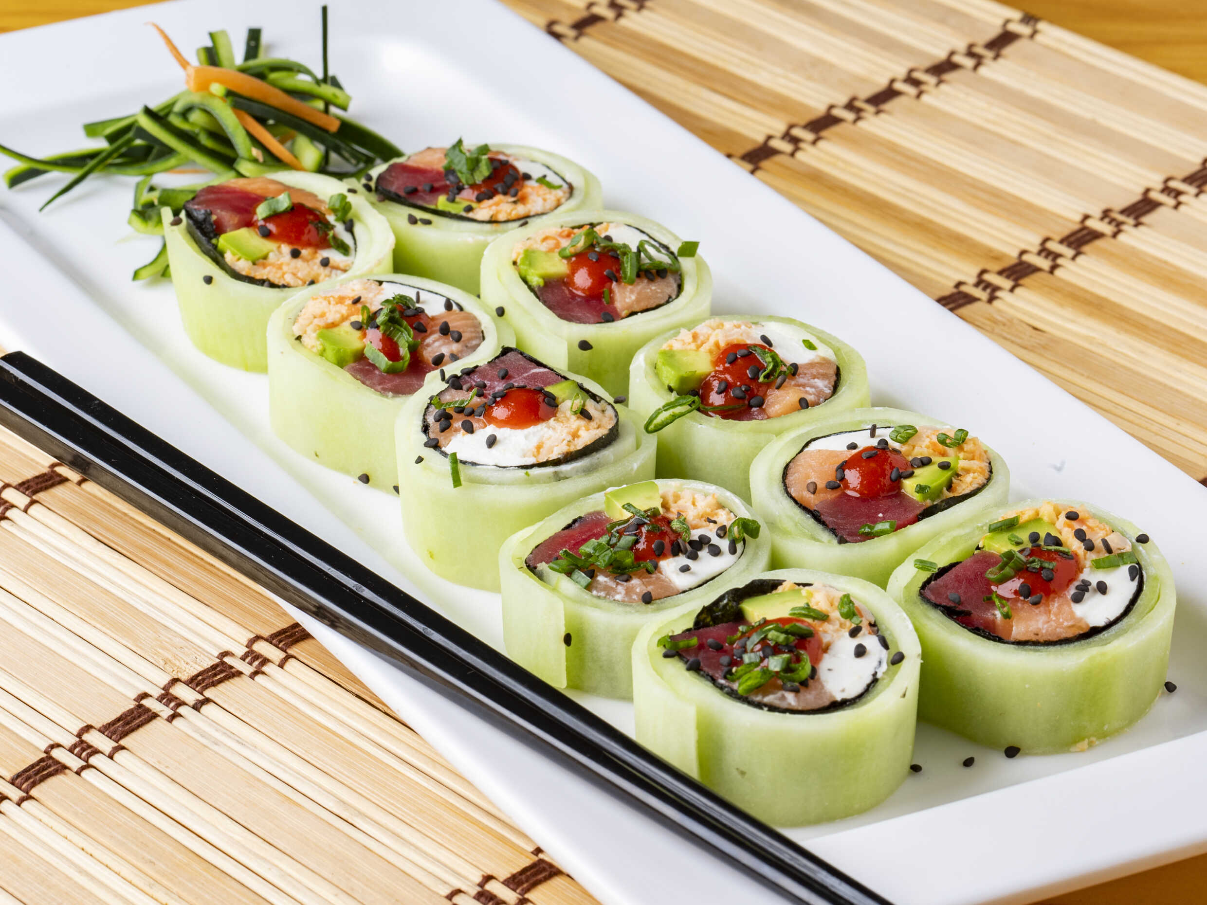( SIN ARROZ) Rollo Envuelto en pepino , relleno de atún, salmón, ensalada de surimi, aguacate y Philadelphia (SIN ARROZ)