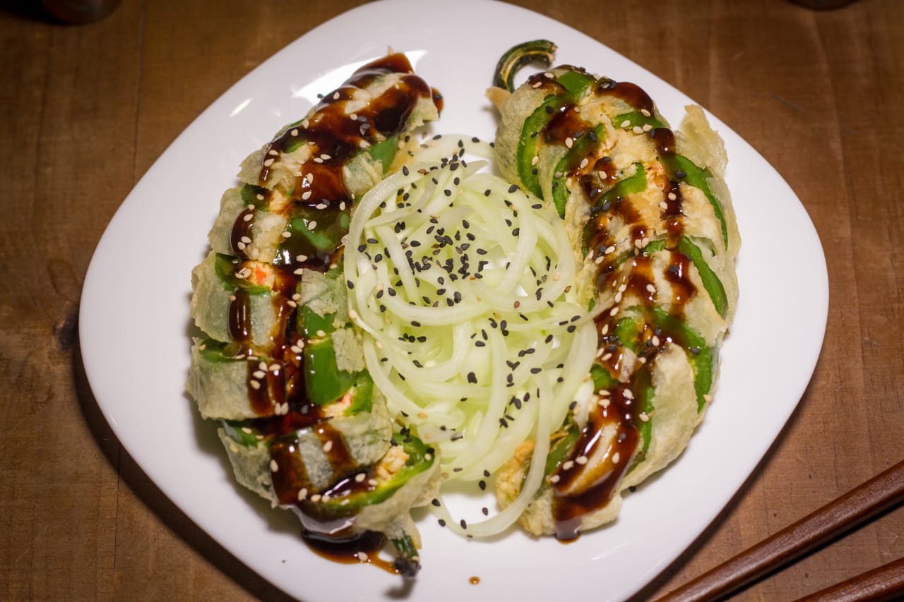 2 Jalapeños frescos rellenos de ensalada de surimi y philadelphia capeados y bañados de salsa de anguila