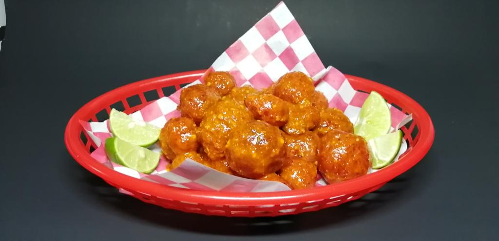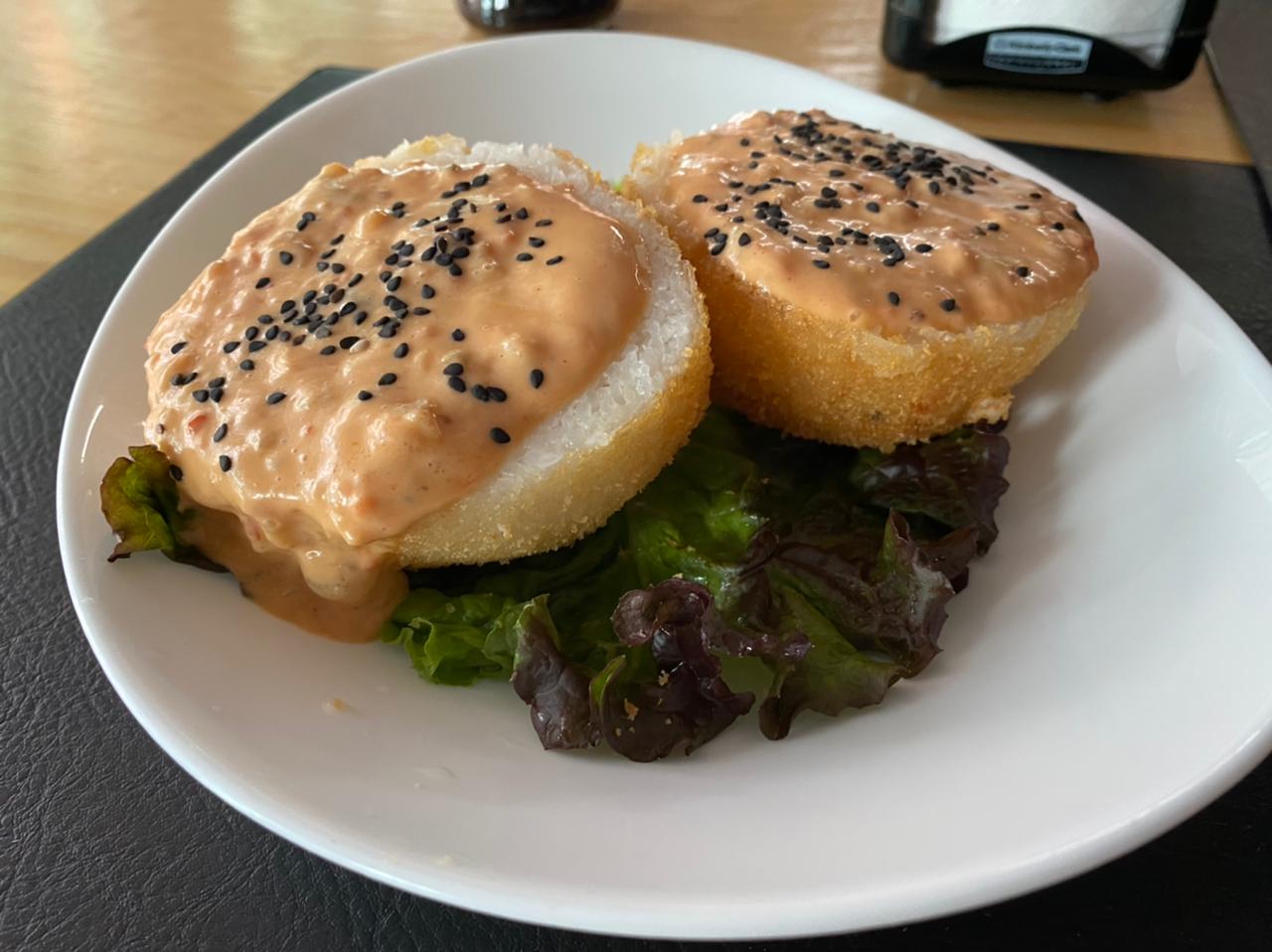 Bola de arroz rellena de camarón y queso philadelphia empanizada y bañada de aderezo mil islas