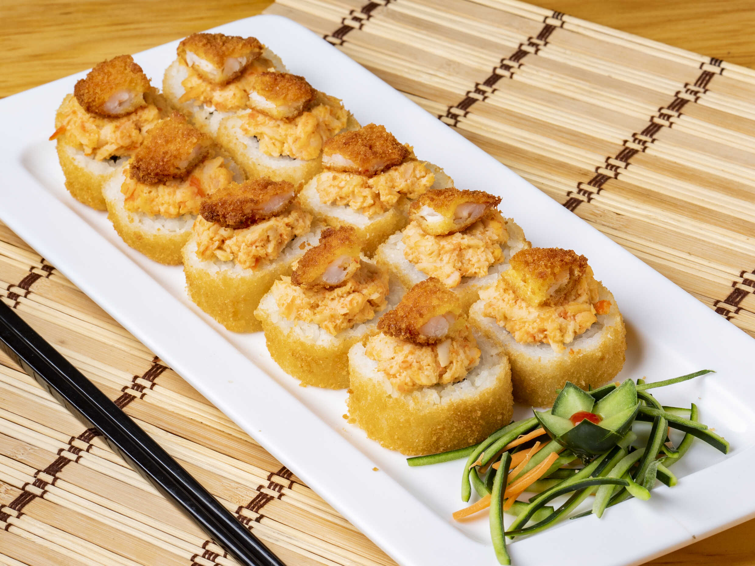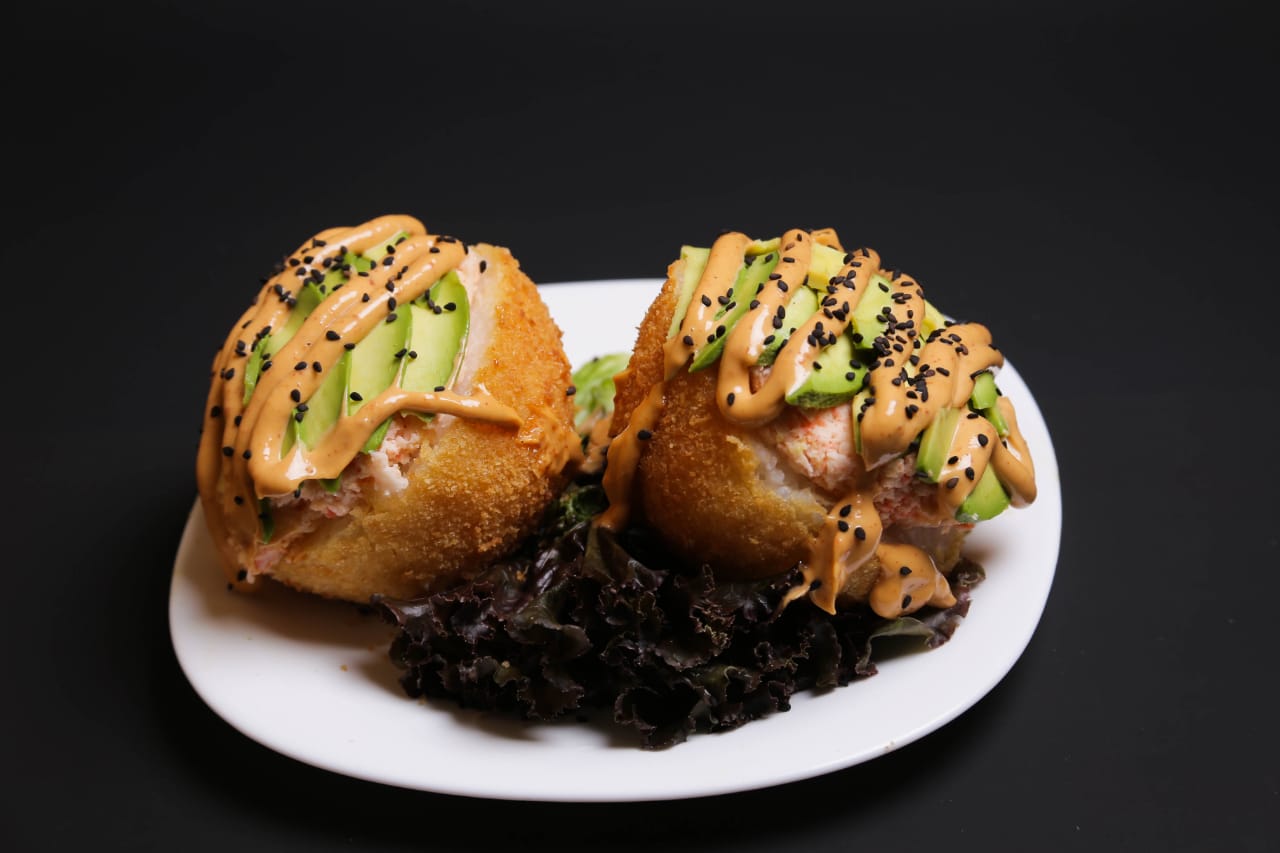 Bola de arroz , rellena de camarón queso Philadelphia empanizada , coronada con ensalada de surimi rebanadas de aguacate y bañada con aderezo chipotle