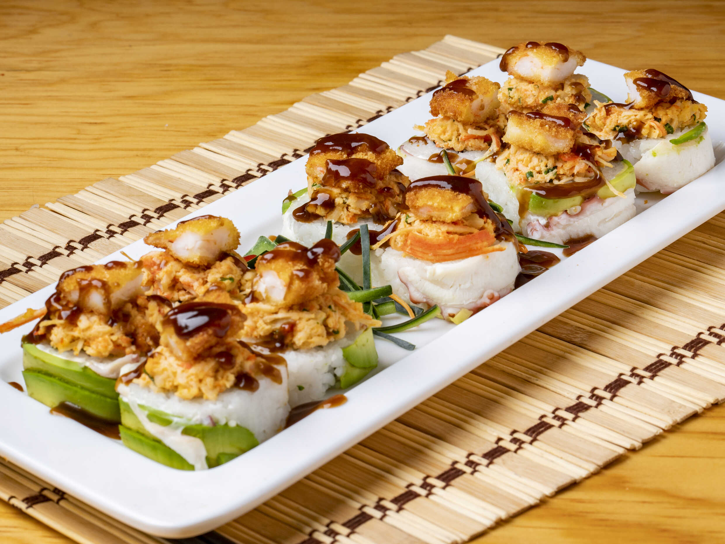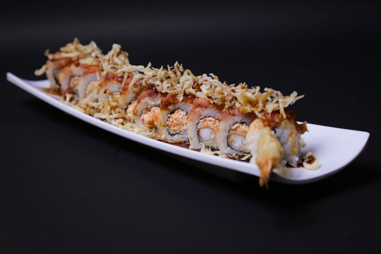 Rollo cubierto con Spicy Tuna , relleno de camarones tempura y ensalada de surimi con un toping de crujiente fritura bañado en salsa de anguila