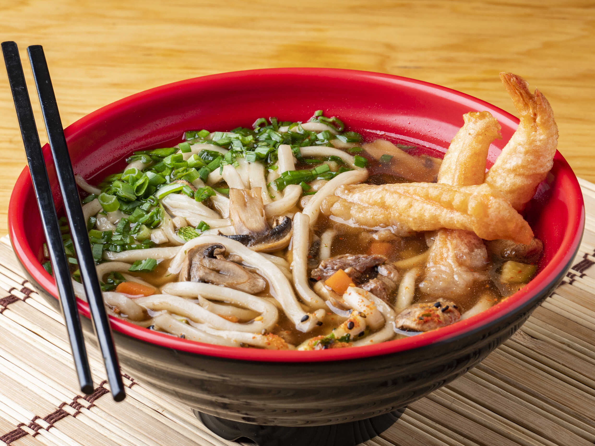 Ricos fideos gruesos en caldo sazona estilo japones, preparado con zanahoria, calabaza y trocitos de champiñon, acompañado 1 camaron y 2 verdura en tempura