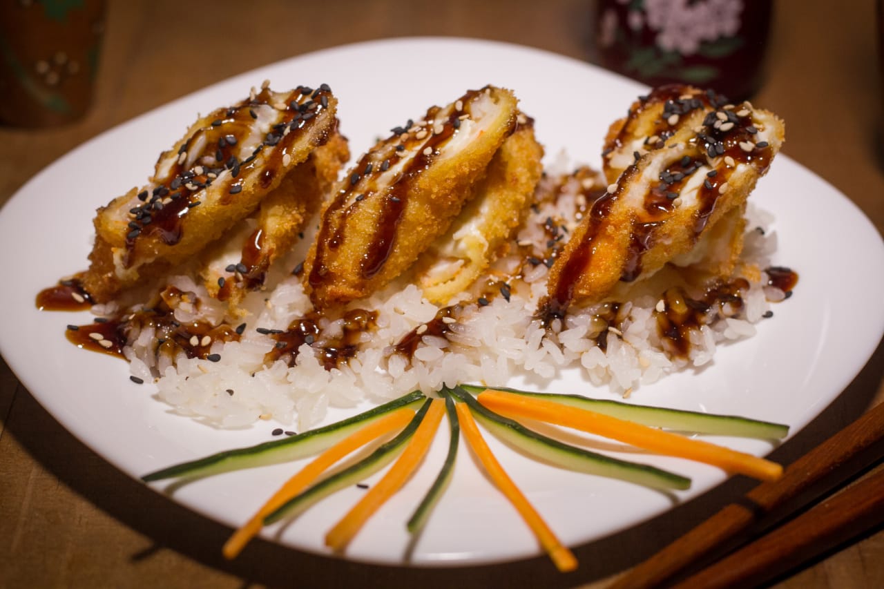 Camarones rellenos de queso philadelphia, empanizados y bañados de salsa de anguila (3 Piezas)