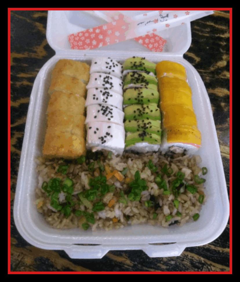 20 bocadillos (5 banana, 5 empanizado, 5 Philadelphia y 5 Avocado + 1/2 porción de Yakimeshi vegetariano para dos