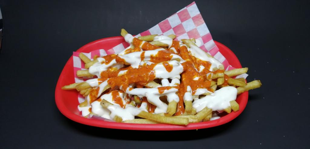 300grs papas ala francesa bañadas de aderezo Ranch y salsa Flaming