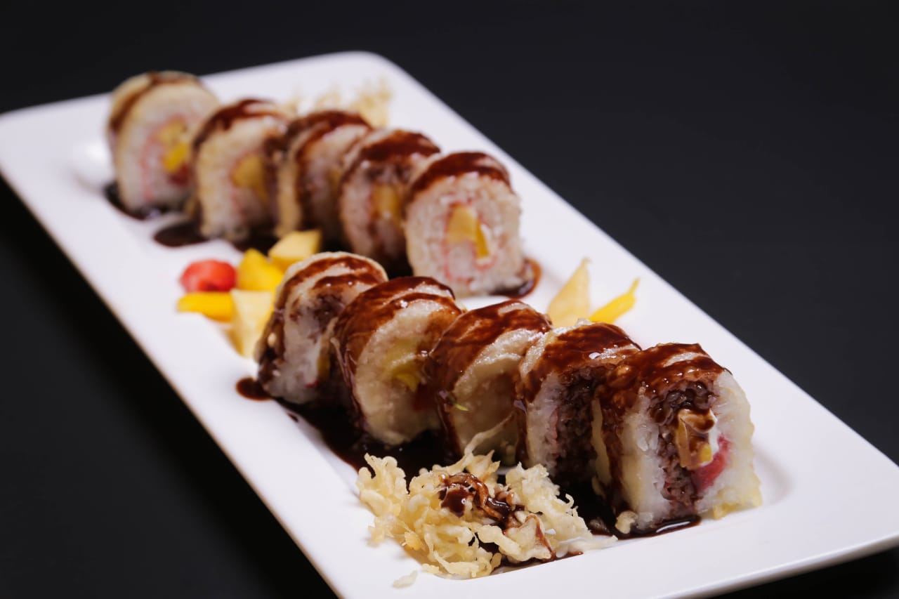 Rollo en tempura relleno de fresa, platano macho, philadelphia y mango o durazno segun la temporada bañado en chocolate hershey´s