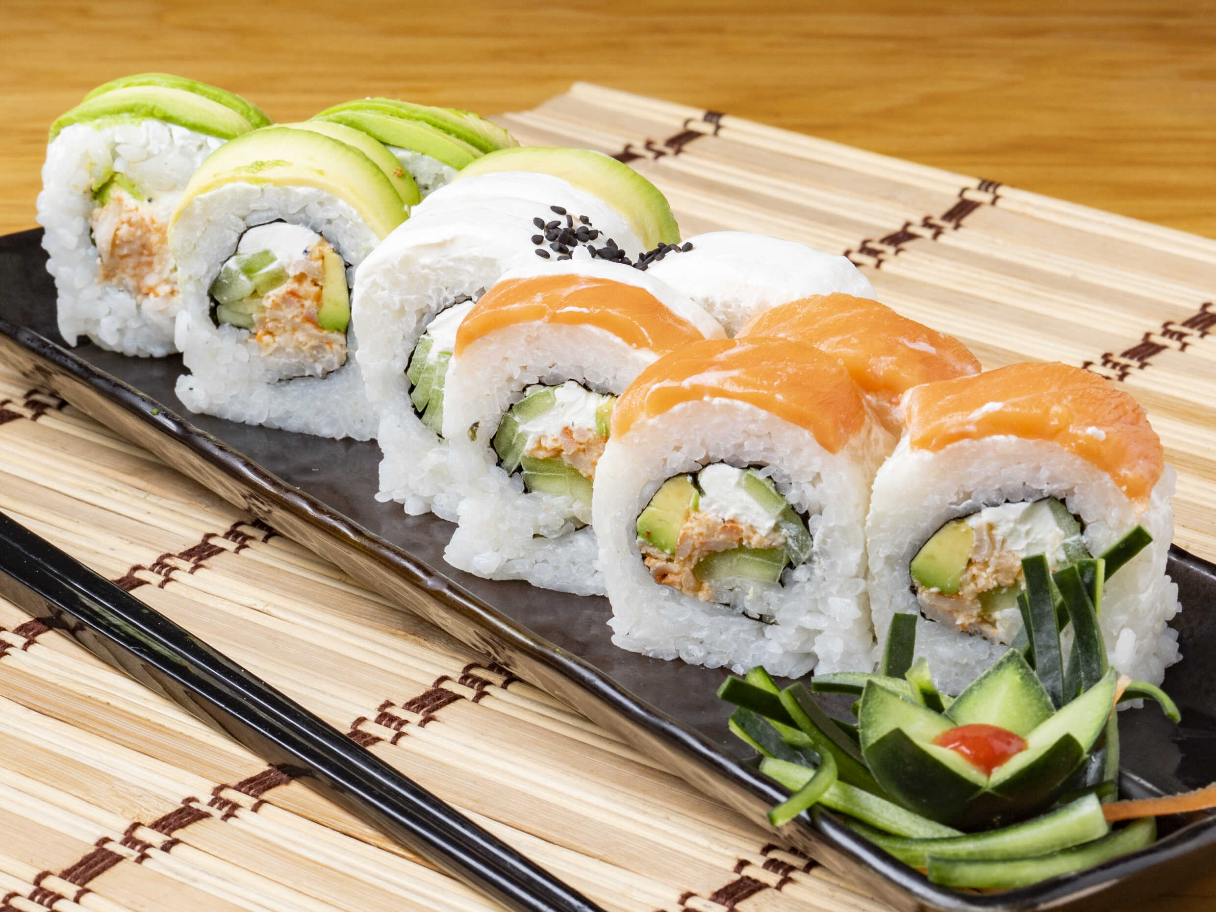 Rollo cobierto con aguacate, queso philadelphia y salmón, relleno de pepino, aguacate, philadelphia y ensalada de surimi