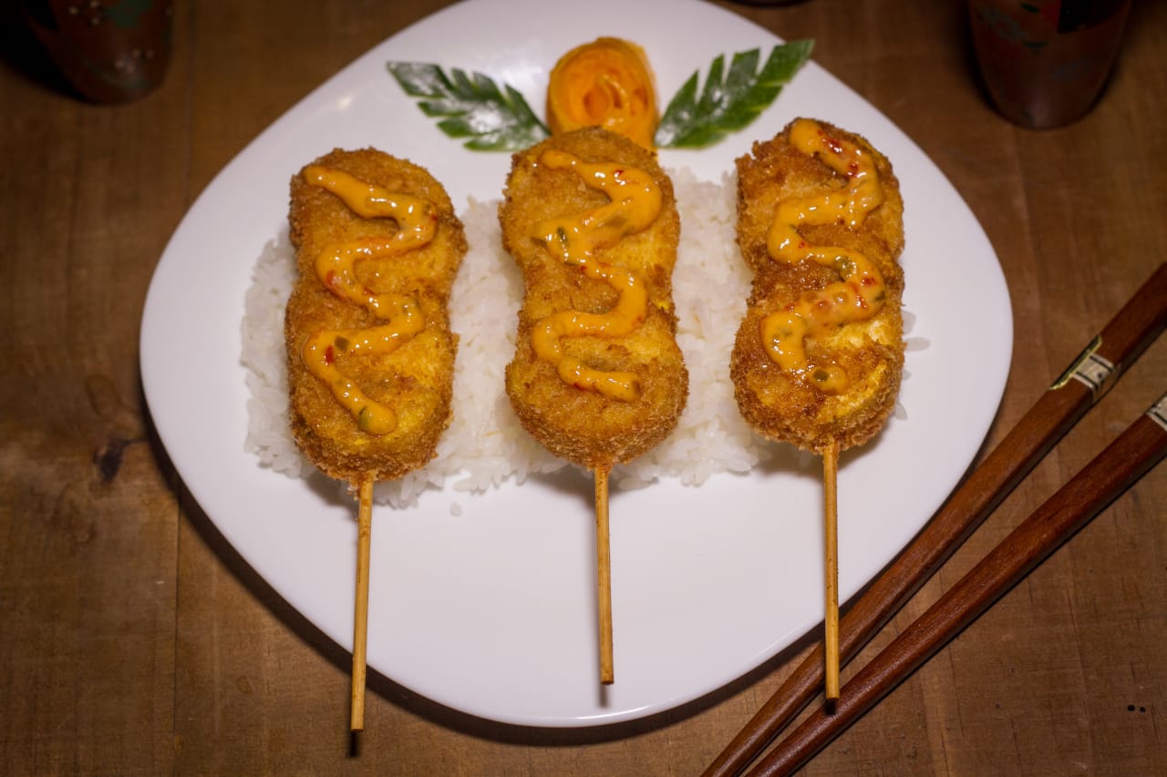 Brochetas de plátano macho y queso philadelphia, empanizadas y bañadas de aderezo mil islas (3 Piezas)