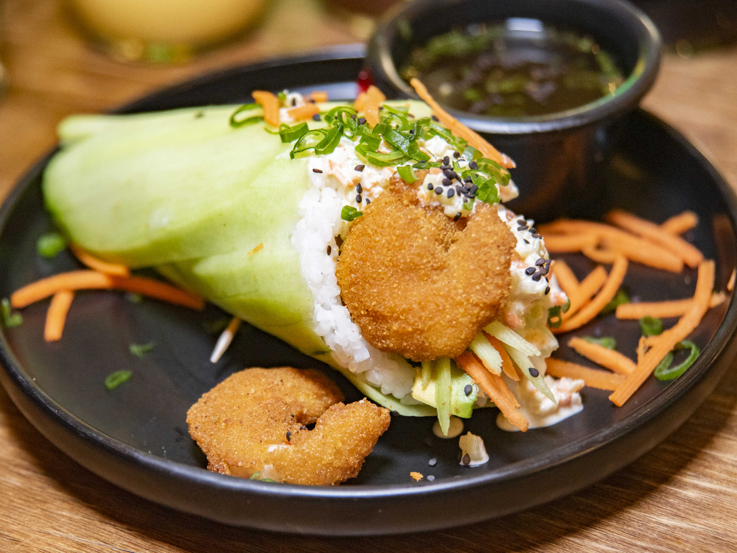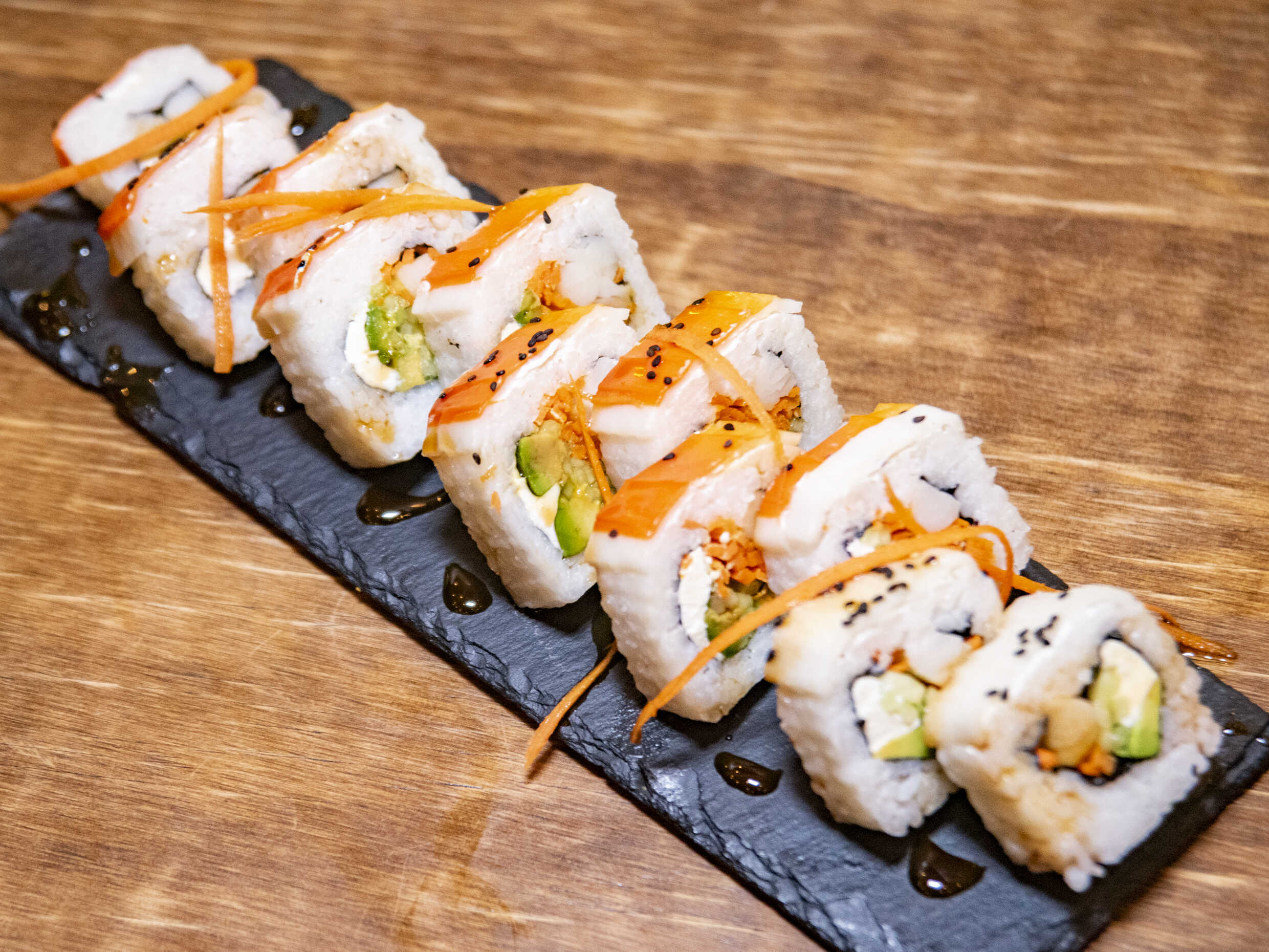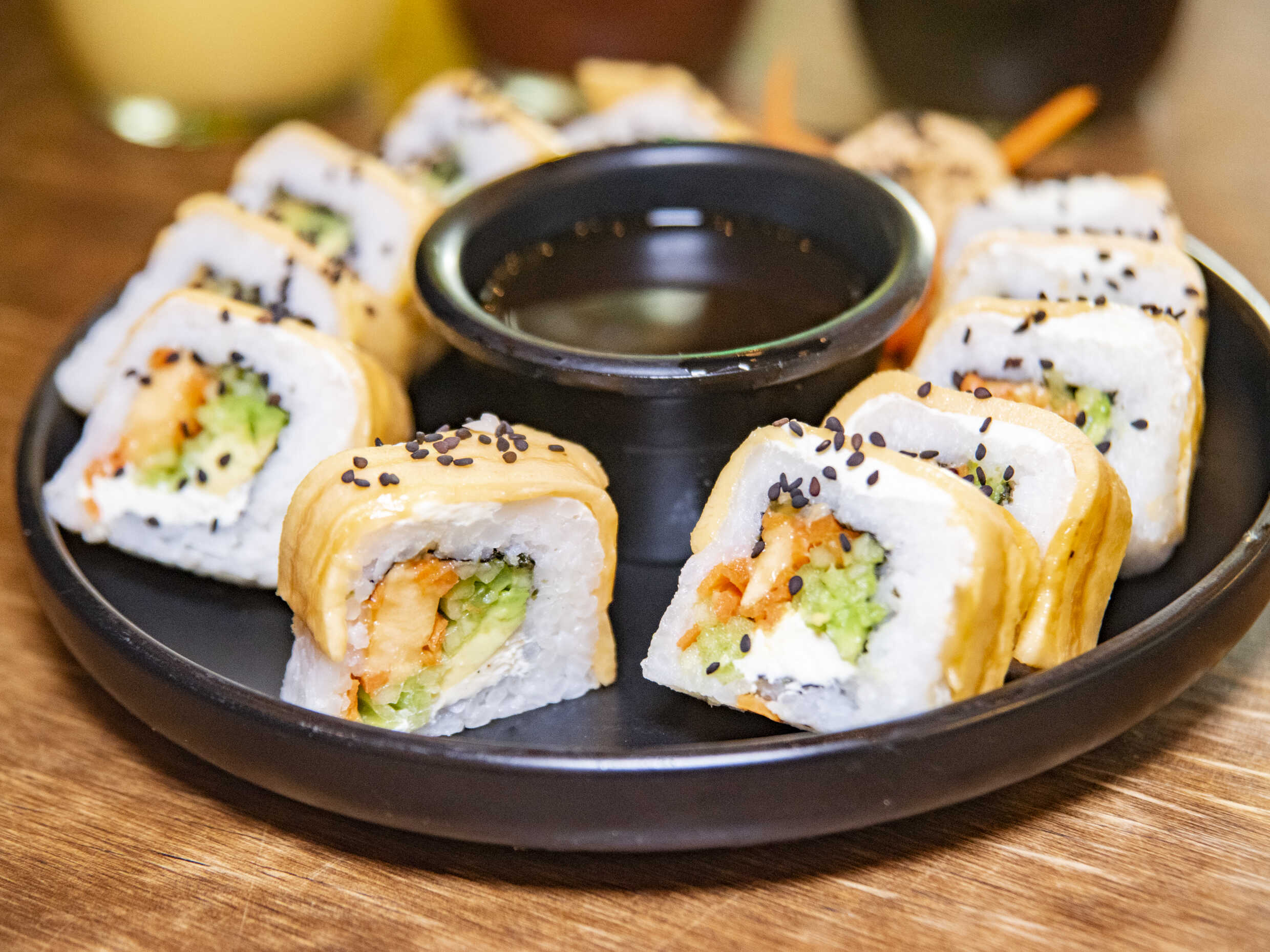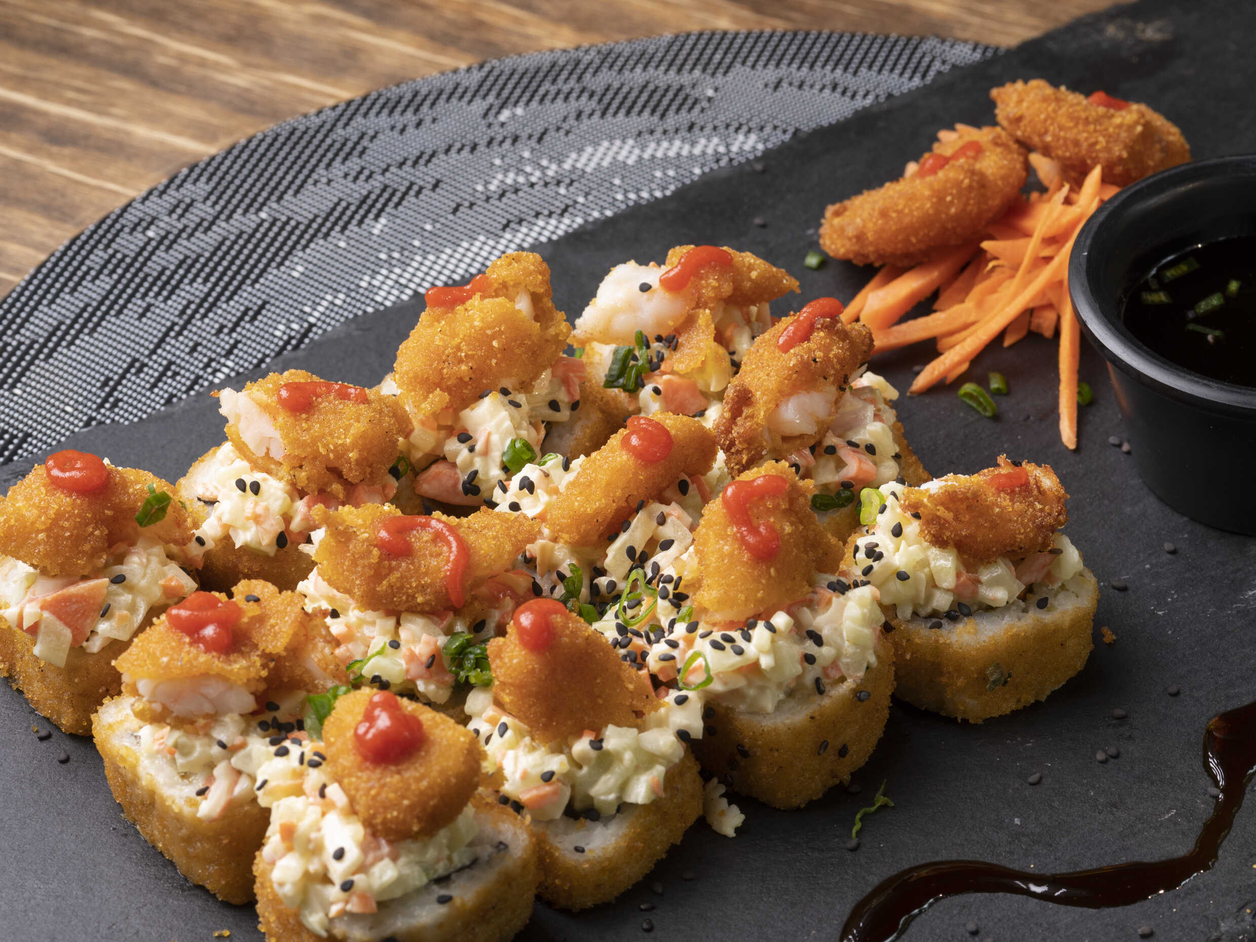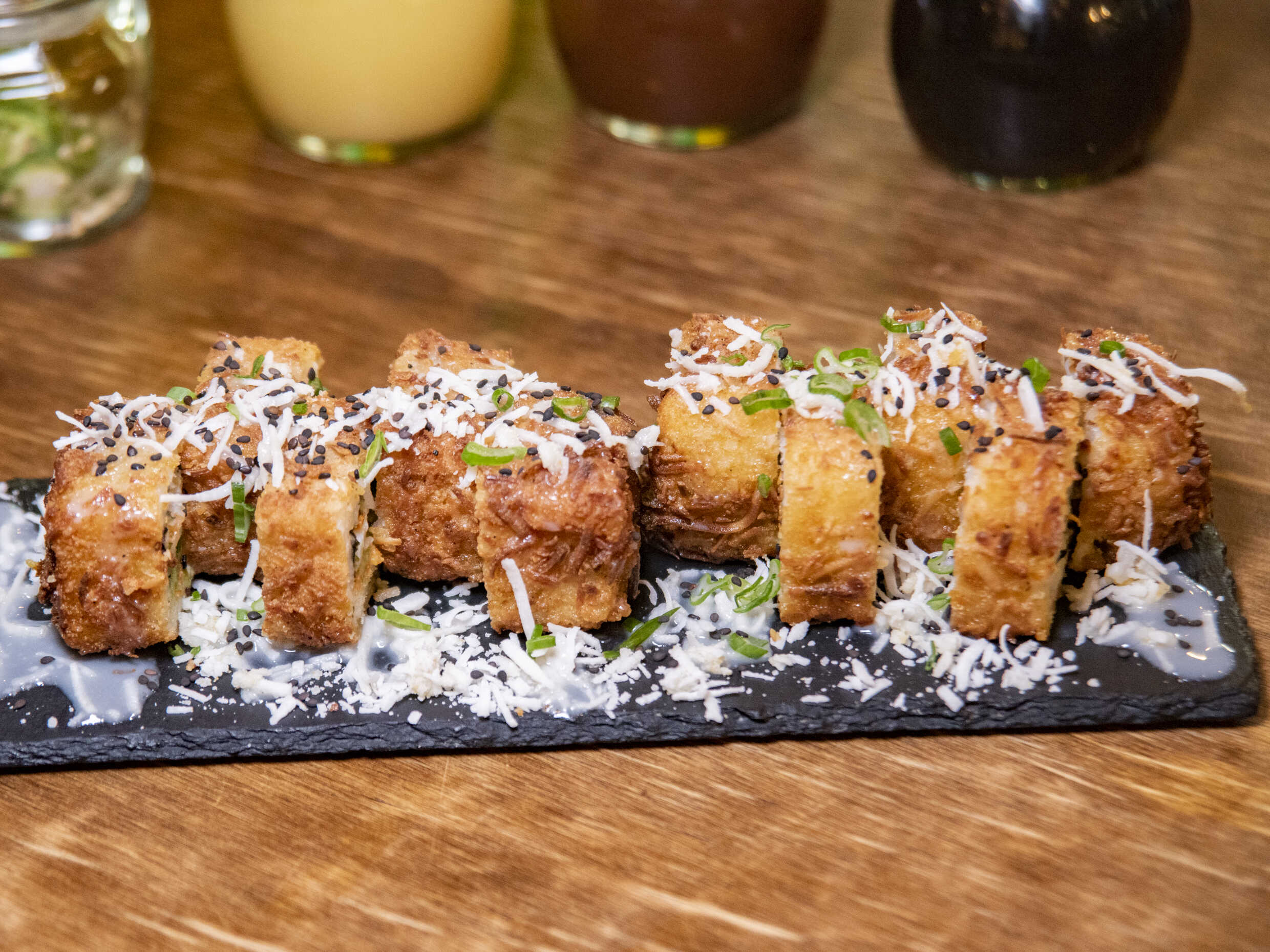 Sushi empanizado con coco, relleno con salmón, aguacate, queso crema y aderezo especial.