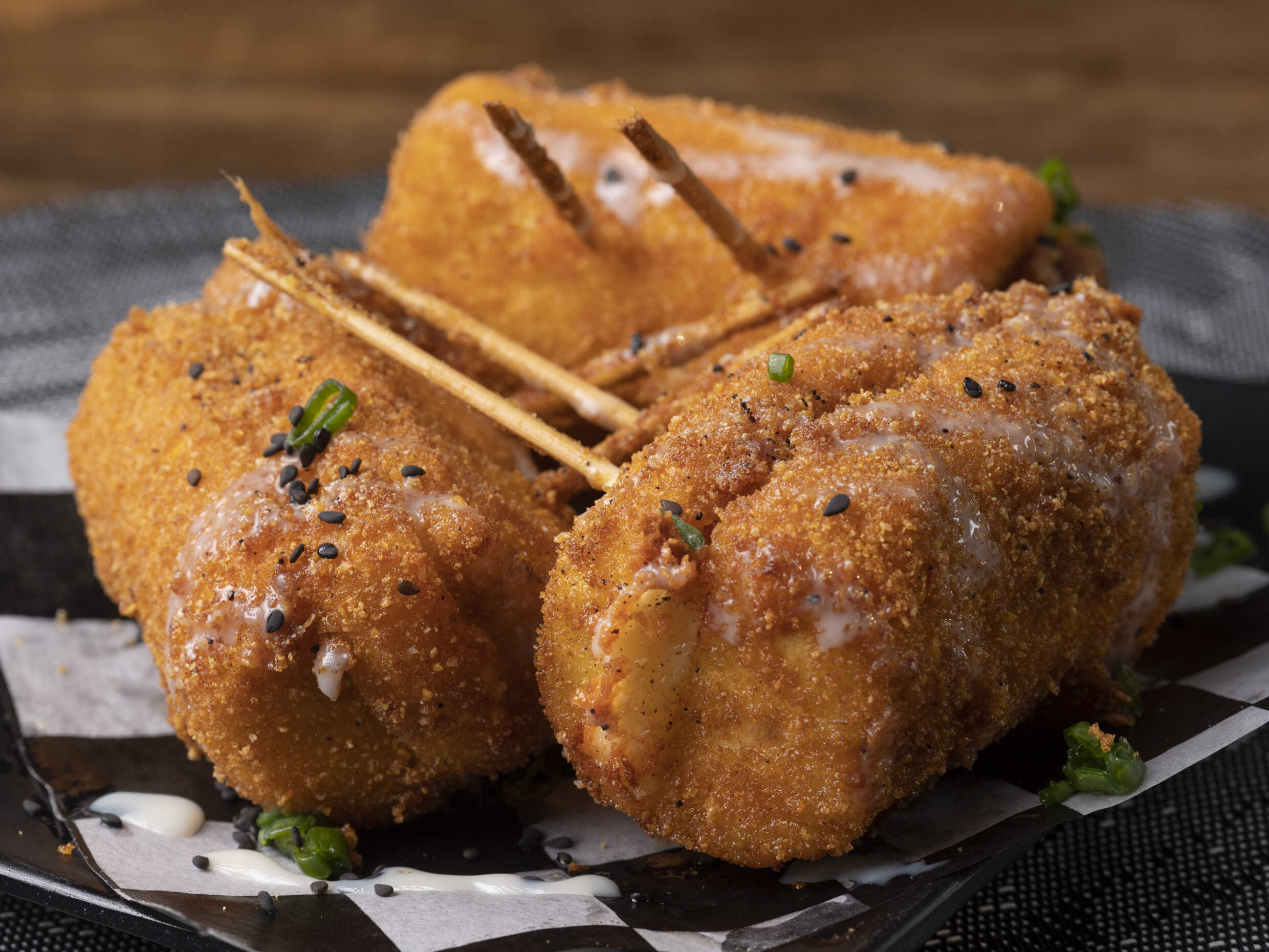 2 pzas, pelotas de arroz empanizadas, rellenas de queso crema y proteína a elegir.