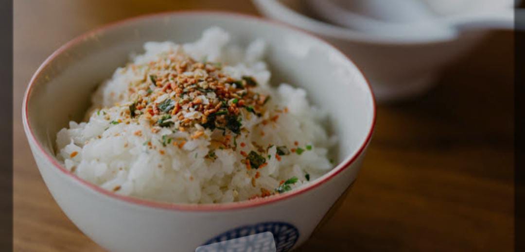 Tazón de arroz al vapor con ajonjolí y cebollín.