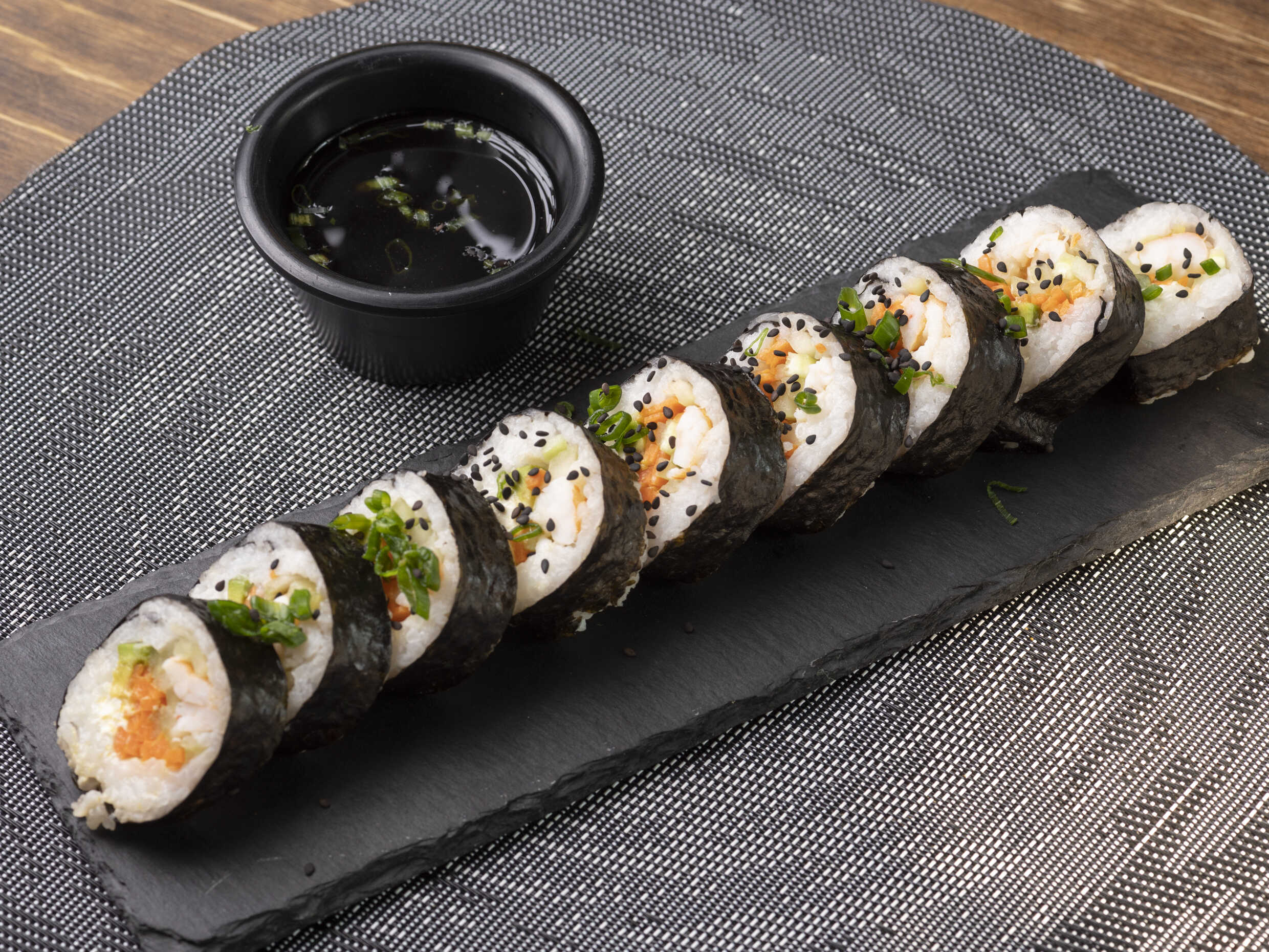 Sushi con alga por dentro, lleva pollo, res, camarón y empanizado.