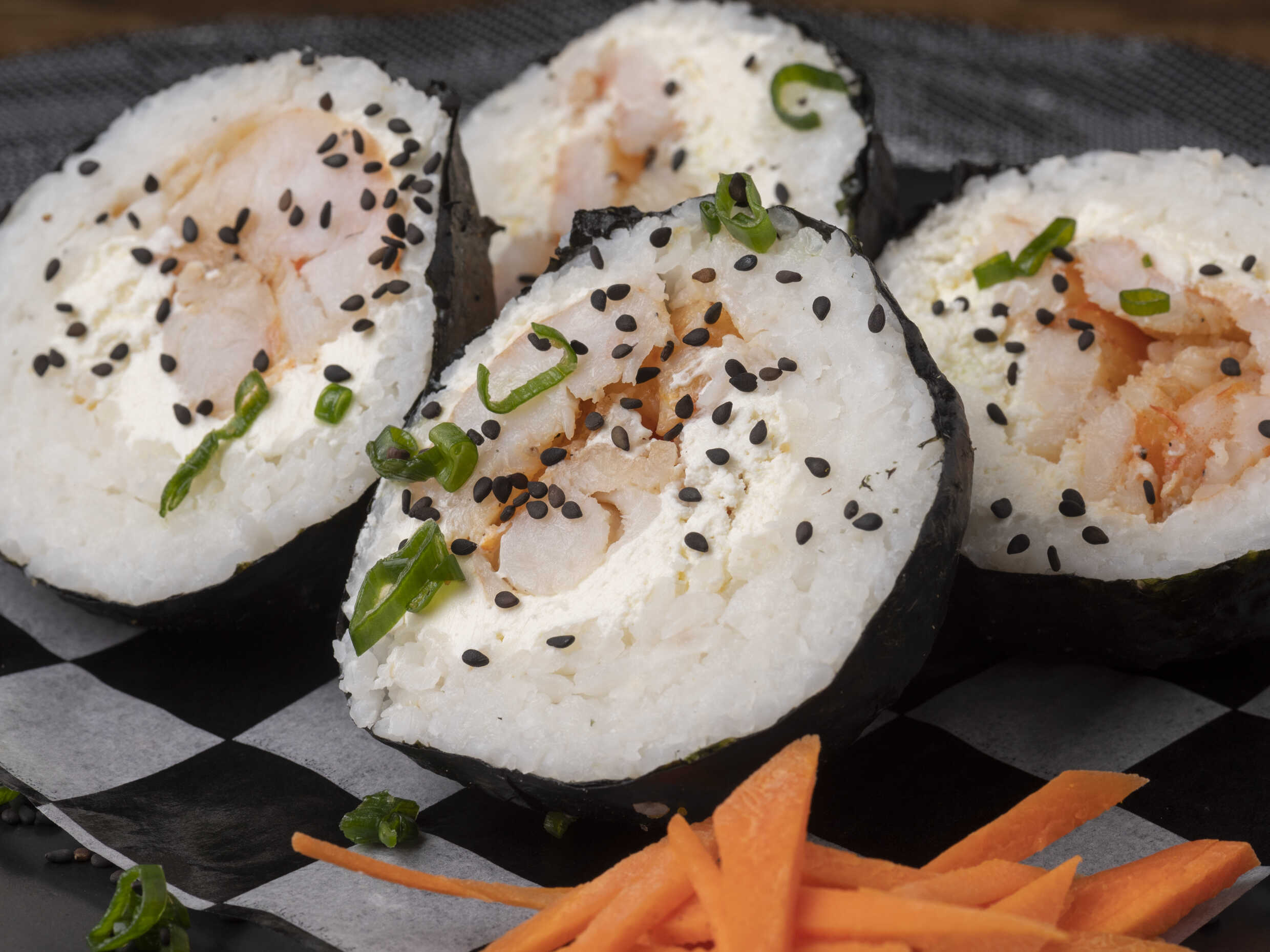 Pelotas de arroz envueltas de hoja de alga rellena de queso crema y proteína a elegir.