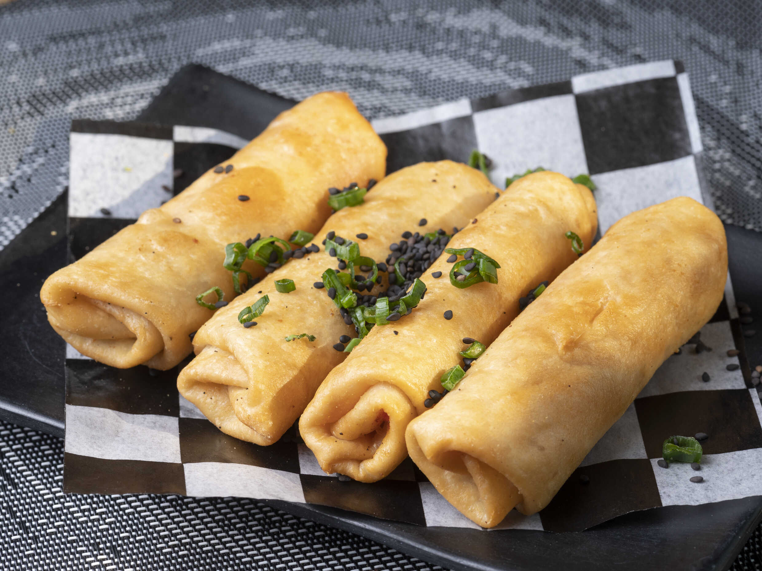 Rollitos de harina rellenos de camarón y queso crema, acompañados con salsa agridulce, 4 piezas.
