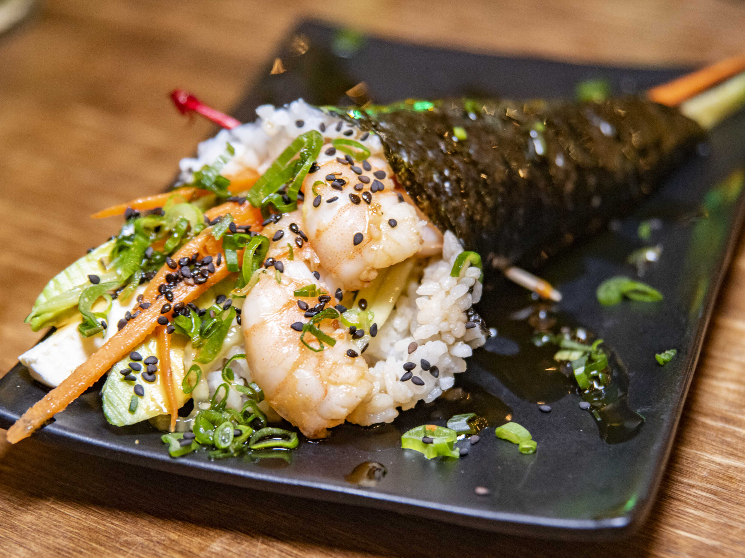 Cono de alga con arroz al vapor, pepino, zanahoria queso crema y proteína a elegir.